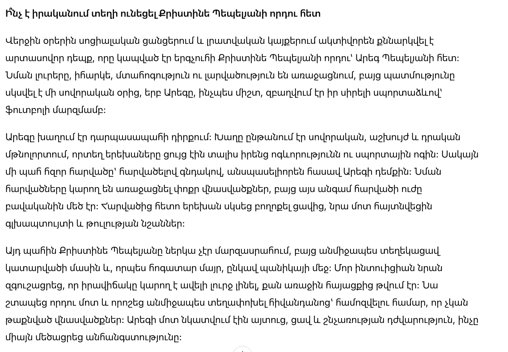 В последние дни в социальных сетях и на новостных ресурсах активно обсуждали неожиданный инцидент, связанный с сыном певицы Кристине Пепелян, Арегом Пепелян. Хотя подобные новости вызывают напряжение и беспокойство, история началась в обычный день, когда Арег, как обычно, участвовал в любимом спортивном занятии — футбольной тренировке.