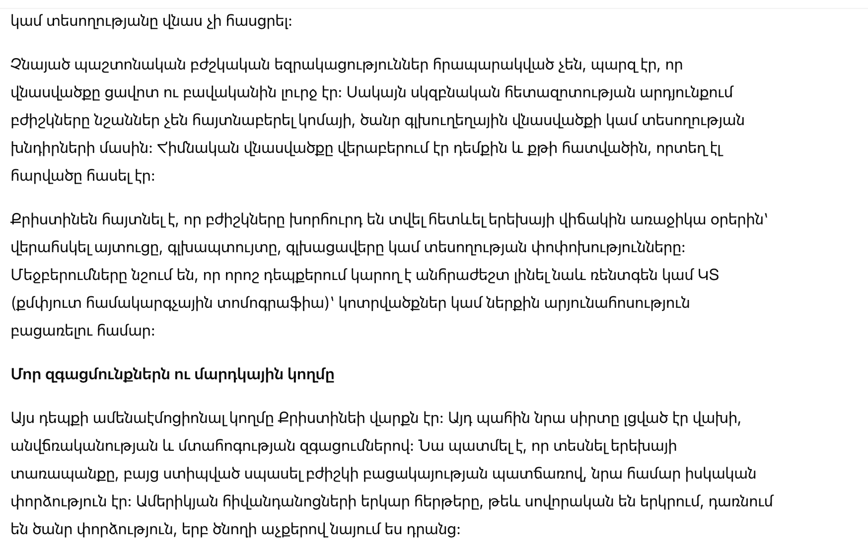 Самым эмоциональным аспектом этого происшествия было поведение Кристине. В тот момент ее сердце переполняло чувство страха, беспомощности и тревоги. Она рассказала, что видеть страдания ребенка, но при этом ждать из-за отсутствия врача, стало для нее настоящим испытанием. Долгие очереди американских больниц, хоть и обычные для этой страны, становятся тяжелым испытанием, когда смотришь на них глазами родителя.