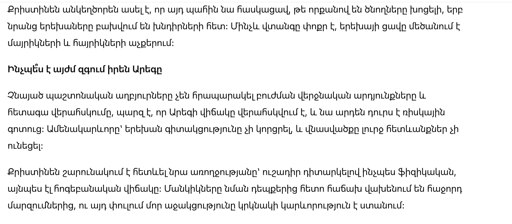 Хотя официальные источники не выделяют окончательные результаты лечения и последующего контроля, понятно, что состояние Арега контролируется, и он уже вышел из зоны риска. Самое главное, что ребенок не терял сознание, и травма не обернулась серьезными последствиями.