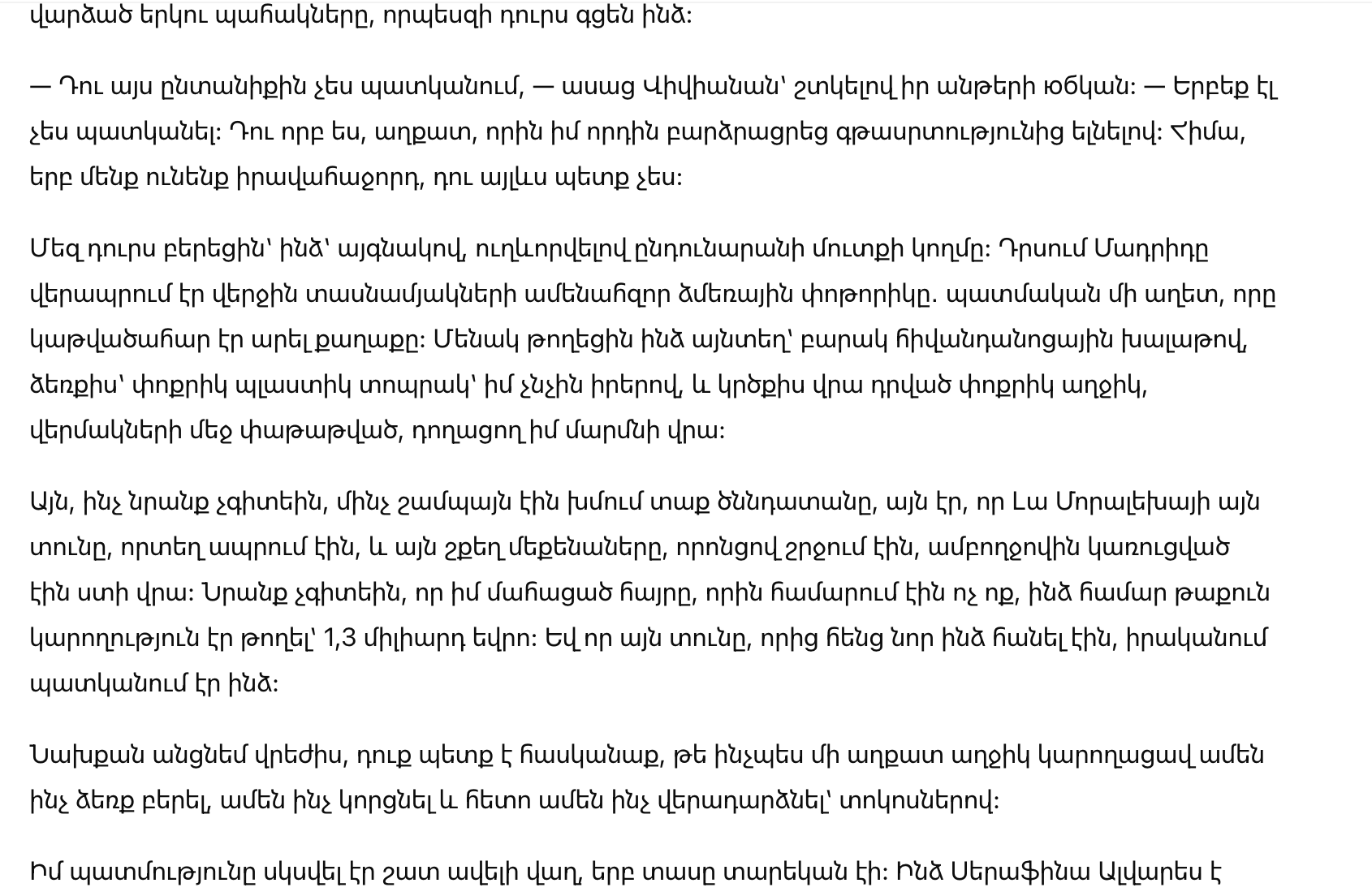 То, чего они не знали, пока запивали шампанским в теплом роддоме, так это то, что тот дом в Ла Моралеха, где они жили, и те роскошные машины, которыми они управляли, были построены на лжи. Они не знали, что мой покойный отец, которого они считали никем, оставил мне скрытое состояние в 1,3 миллиарда евро. И что дом, из которого меня только что выгнали, на самом деле был моим.
