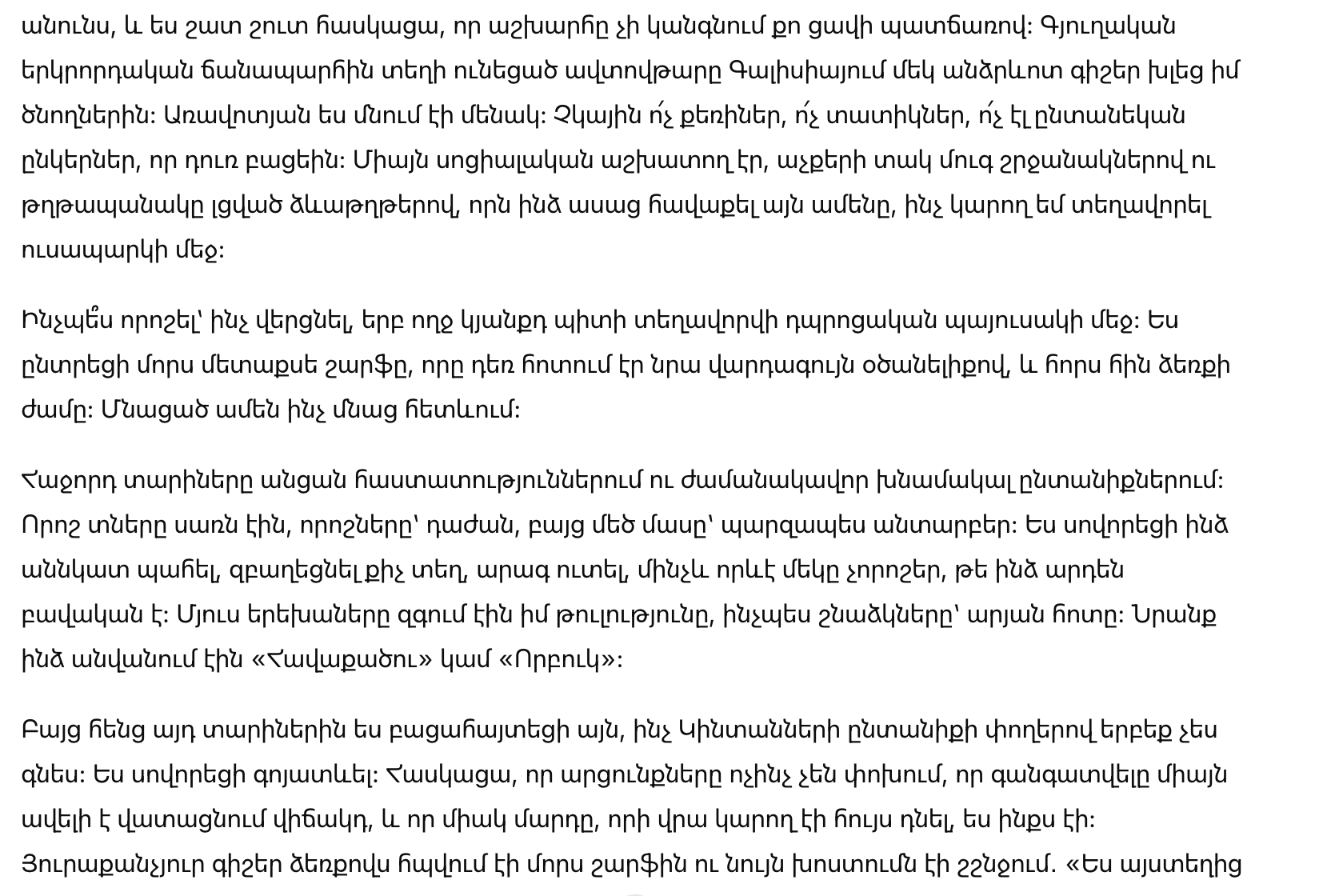 Следующие годы прошли в учреждениях и временных семьях. Некоторые дома были холодными, другие — жестокими, но большинство просто безразличными. Я научилась делать себя малозаметной, не занимать пространство, быстро есть до того, как кто-то решил, что мне хватит. Другие дети чувствовали мою слабость, как акулы чувствуют кровь. Меня называли «Собранной» или «Сироткой».