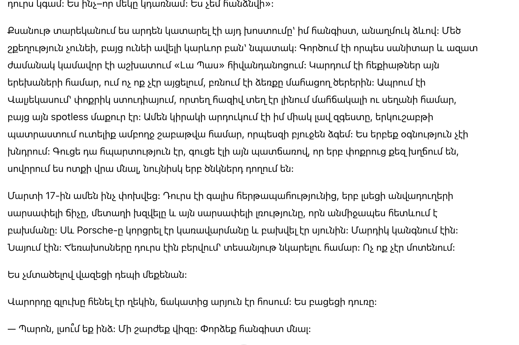 17 марта всё изменилось. Я выходила из смены в больнице, когда услышала визг шин, треск металла и тот ужасный тишину, который следует за ударом. Чёрный Porsche потерял контроль и врезался в фонарный столб. Люди останавливались. Люди смотрели. Люди доставали мобильные телефоны, чтобы записать происходящее. Никто не двигался.