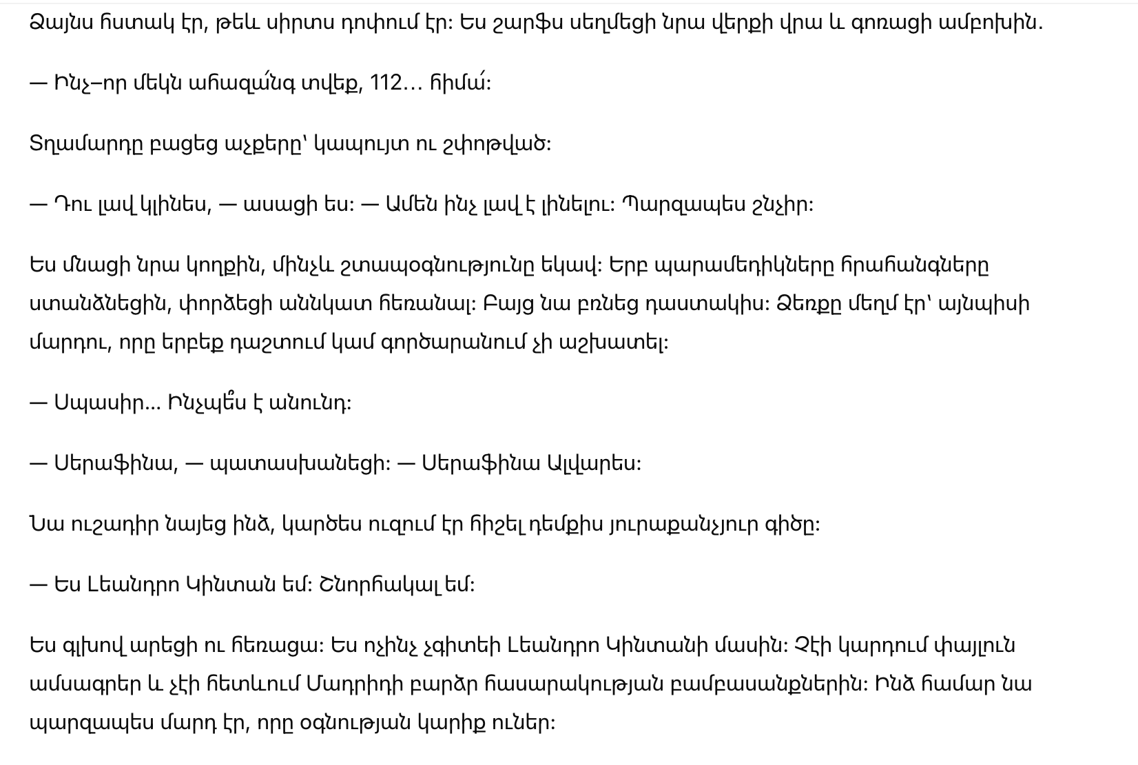 Я осталась с ним до прибытия скорой помощи. Когда парамедики взяли ситуацию под контроль, я попыталась ускользнуть. Но он схватил меня за запястье. Его рука была нежной, как у того, кто никогда не работал в поле или на заводе.