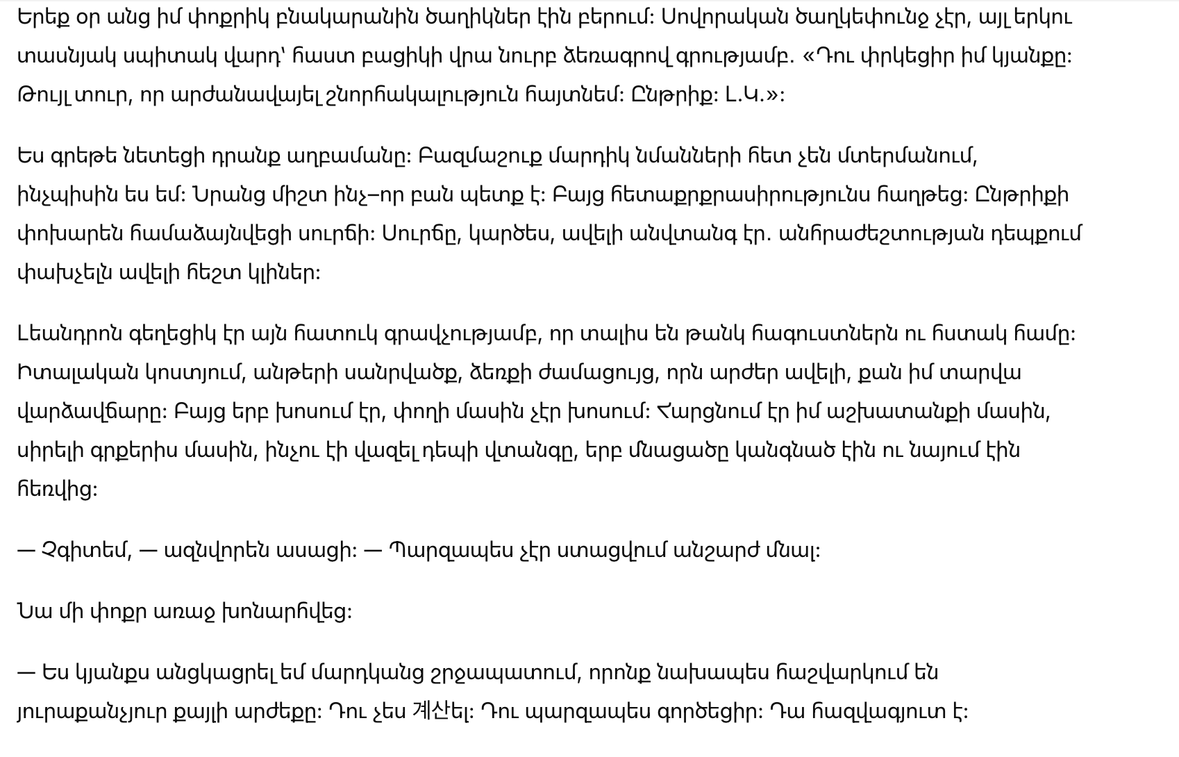 Леандро был хорош собой по дорогому крою. Итальянский костюм, идеальная стрижка, часы, стоившие больше, чем мой годовой аренда. Но, когда он говорил, он не говорил о деньгах. Он спрашивал о моей работе, о моих любимых книгах, почему я устремилась к опасности, когда все остальные оставались стоять.