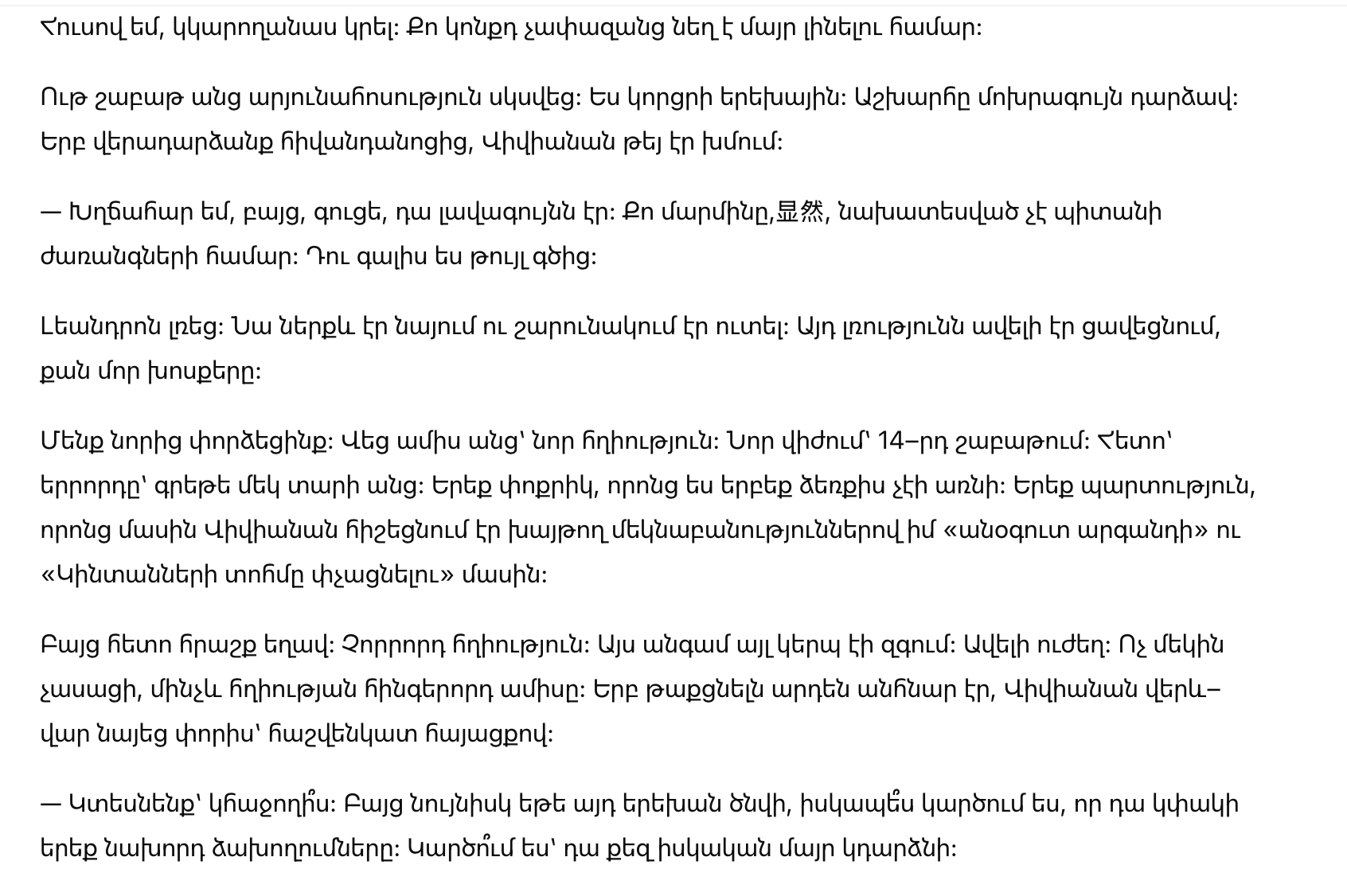 Но затем произошло чудо. Четвёртая беременность. На этот раз я чувствовала себя иначе. Сильнее. Я никому не сказала, пока не прошло пять месяцев. Когда скрыть это стало невозможно, Вивиана посмотрела на мой живот с рассчетливым взглядом.