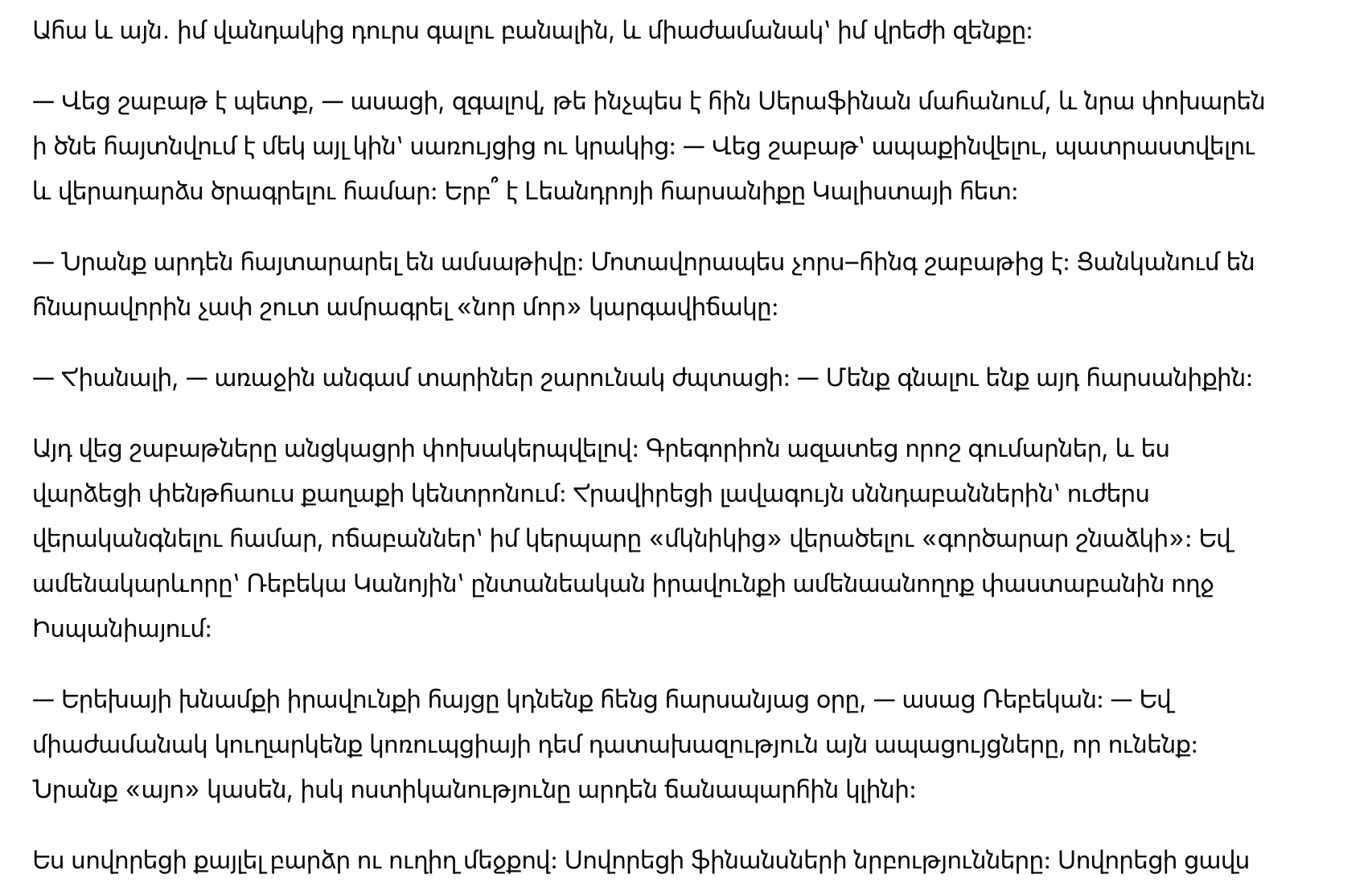 Я провела эти шесть недель, трансформируясь. С деньгами, которые освободил Грегорио, я сняла пентхаус в центре. Наняла лучших диетологов, чтобы восстановить силы, стилистов, чтобы сменить образ из “мышки” на “акулу-деловую женщину”, и, что самое главное, Ребеку Кано, самого безжалостного семейного адвоката в Испании.