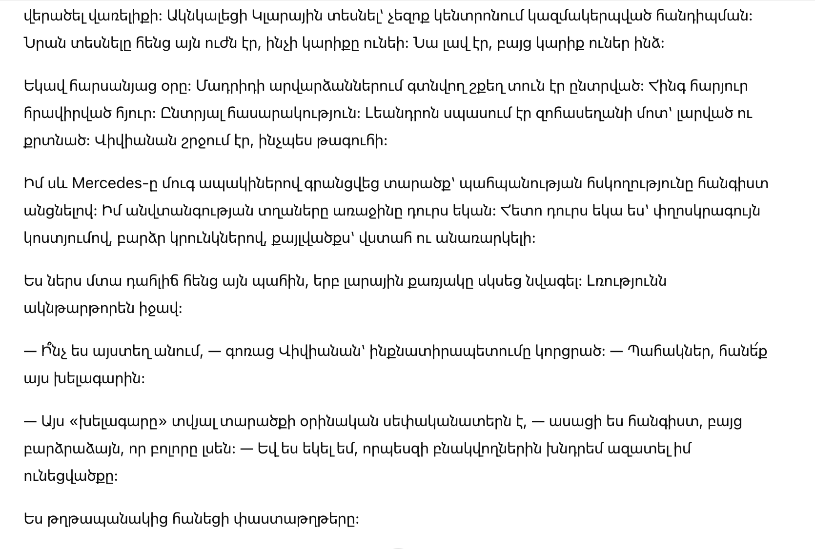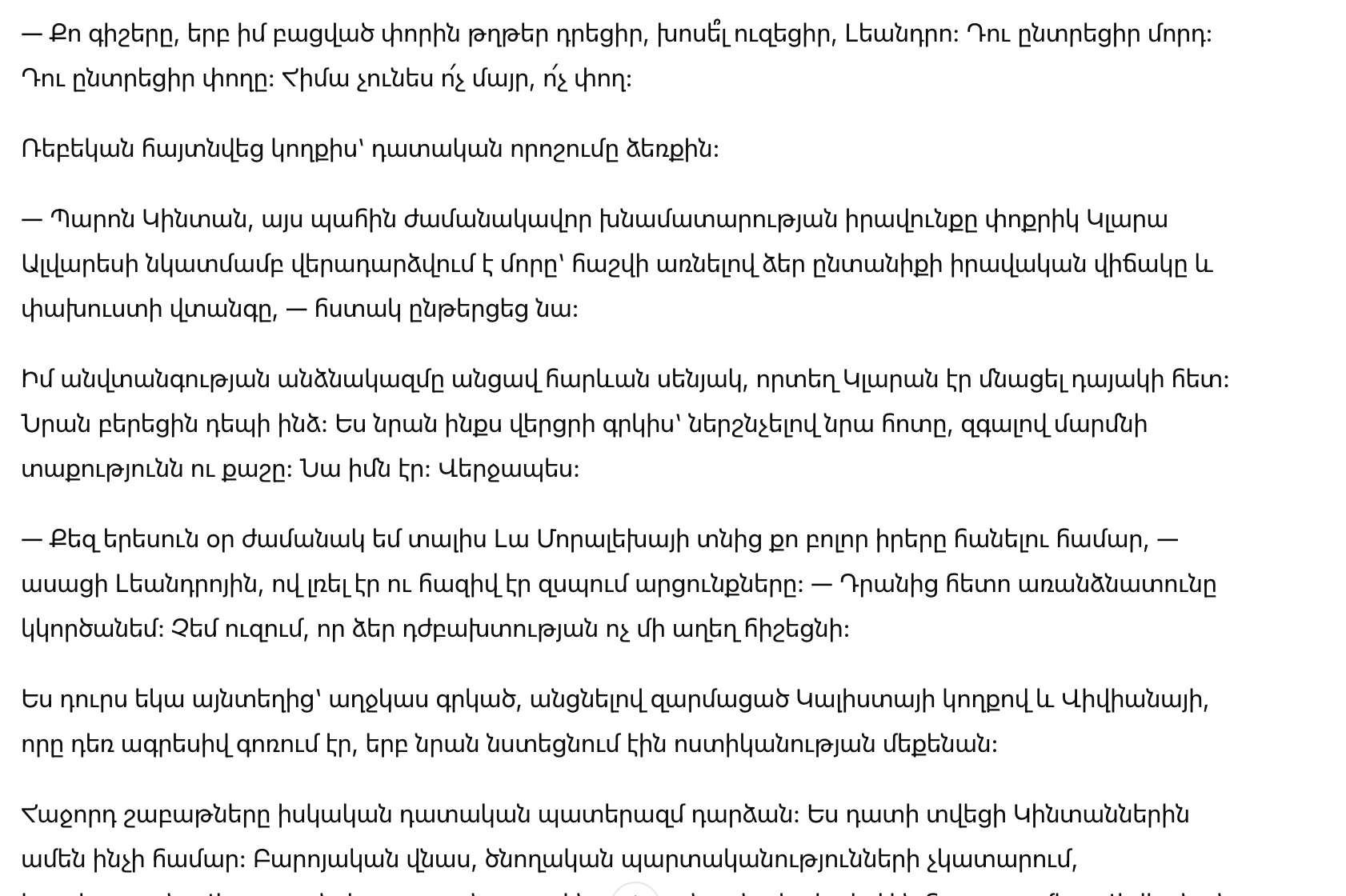 — Господин Кинтан, вам сообщается, что временная опека над малолетней Кларой Альварес немедленно возвращается матери в связи с правовой ситуацией вашей семьи и риском побега.