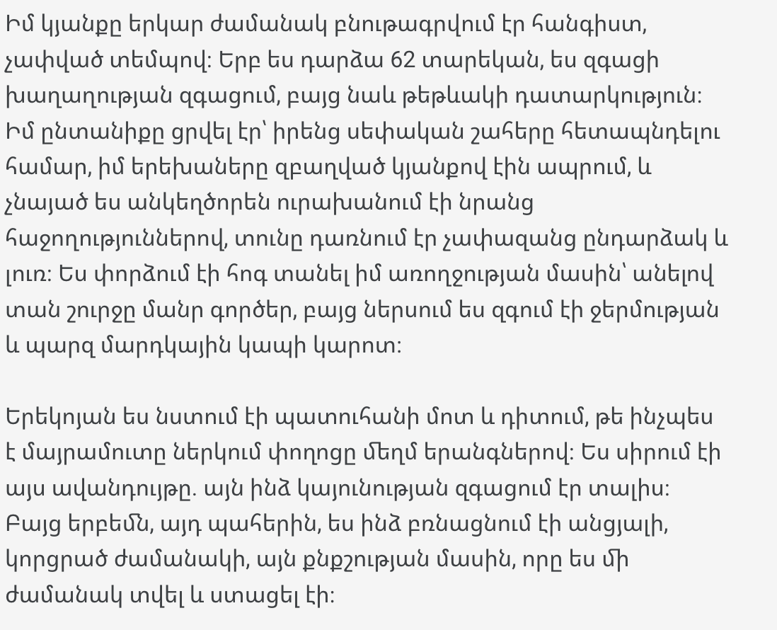 В моей жизни долго царила тихая размеренность. Когда мне исполнилось 62 года, я чувствовала спокойствие, но вместе с ним и легкую пустоту. Семья разлетелась по своим делам, дети жили насыщенной жизнью, и хотя я искренне радовалась их успехам, дом становился слишком просторным и тихим. Я старалась беречь здоровье, занималась небольшими делами по дому, но внутри возникало ощущение, что мне не хватает тепла и простого человеческого общения.