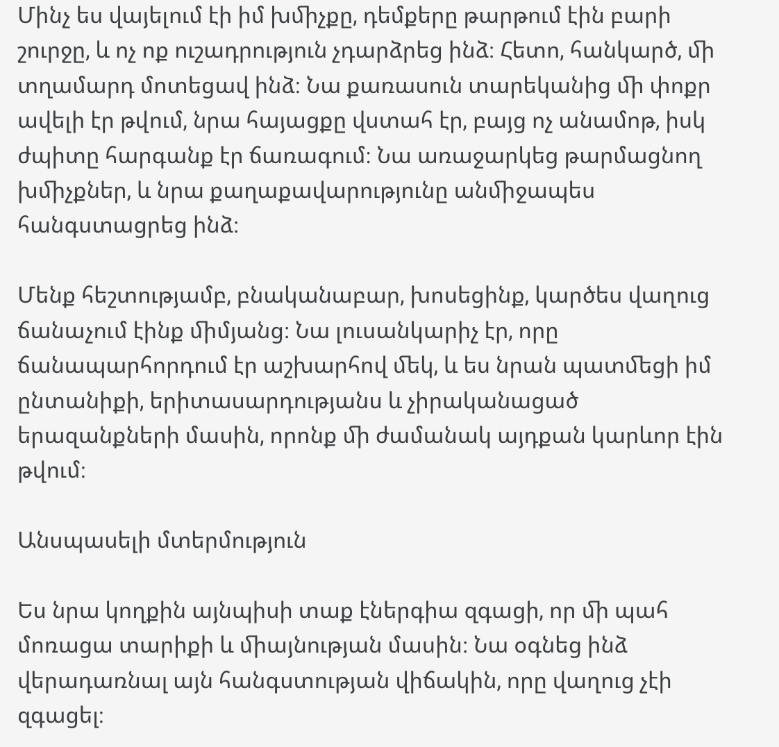 Поэтому я просто надела удобное платье, взяла сумку и отправилась в ночной автобус, который вез меня в центр города. Это решение было импульсивным, но, как оказалось позже, одним из самых судьбоносных.