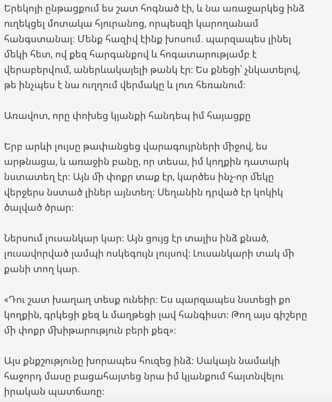 «Вы выглядели очень спокойно. Я лишь сидел рядом, укрыл вас и пожелал вам хорошего отдыха. Пусть эта ночь подарит вам немного уюта».