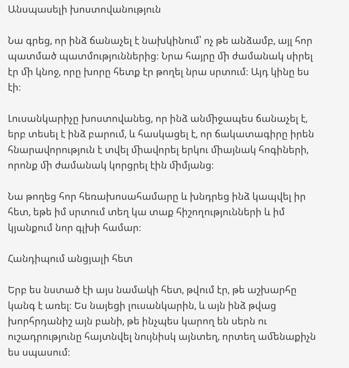 Он написал, что знал меня раньше — не лично, а по рассказам своего отца. Когда-то его отец любил женщину, которая оставила глубокий след в его сердце. Эта женщина была я.