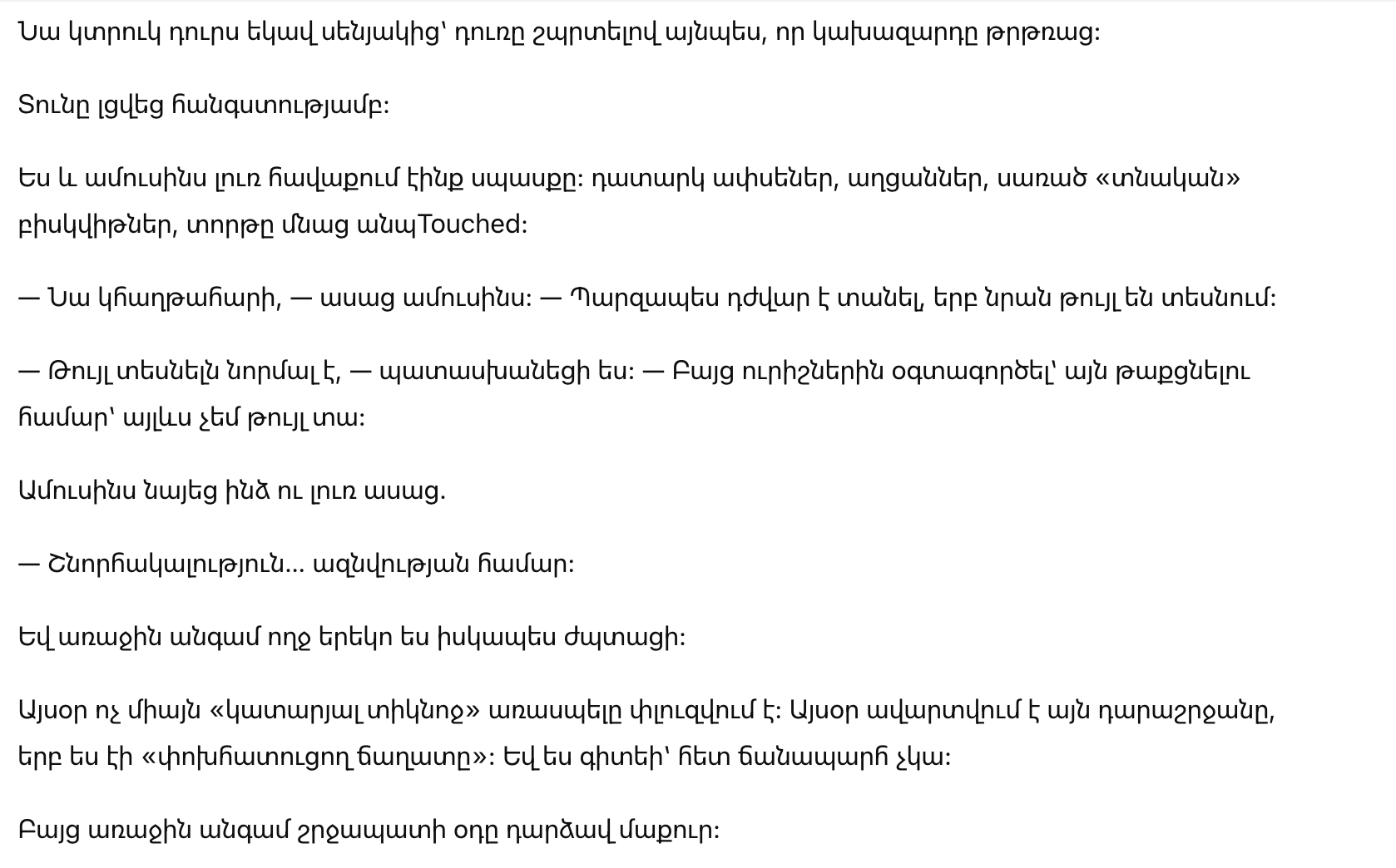 — Она переживёт, — сказал муж. — Просто тяжело переносит, когда её видят слабой.