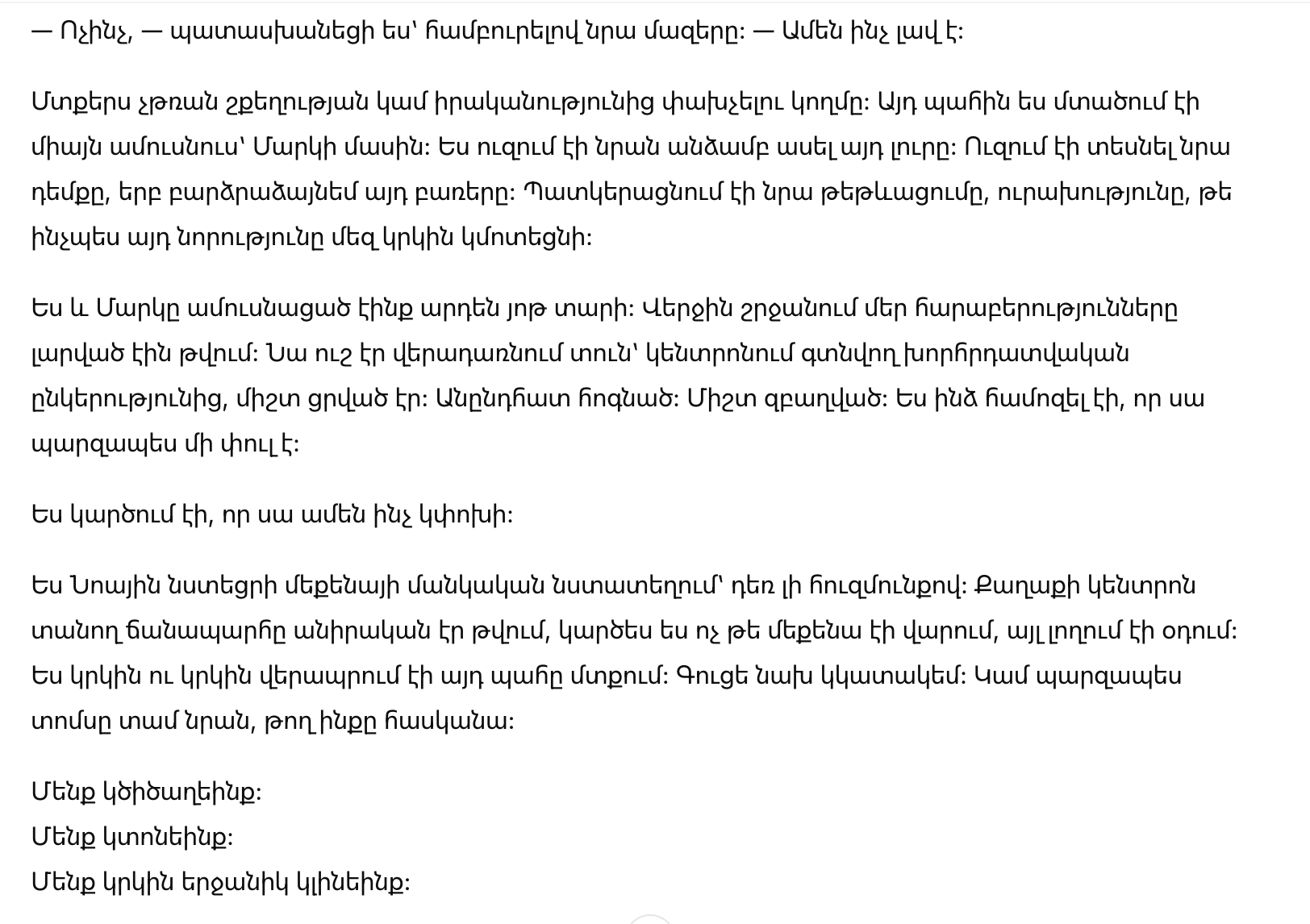 Мы с Марком были женаты уже семь лет. В последнее время наши отношения казались напряжёнными. Он работал допоздна в консультационной компании в центре и был рассеян. Постоянно уставал. Вечно был занят. Я убедила себя, что это всего лишь стадия.