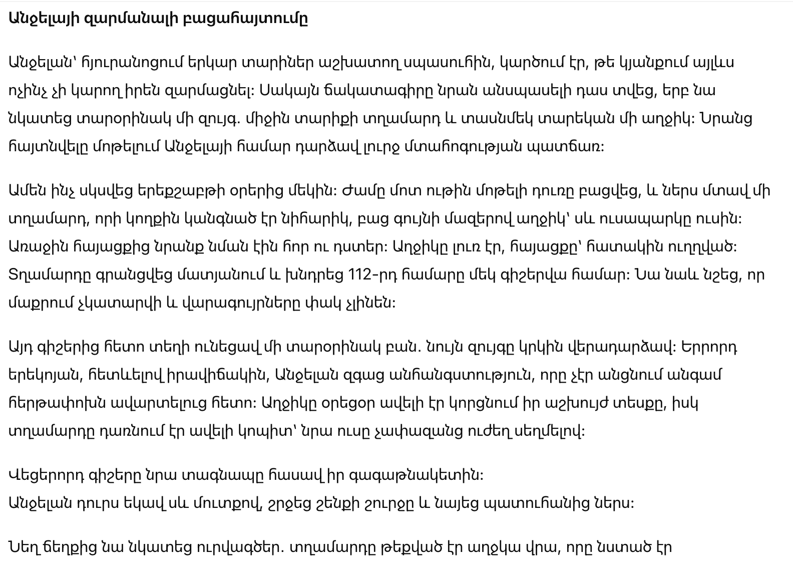 Ночью после этого произошло нечто странное: та же пара снова вернулась. На третий вечер, наблюдая за ситуацией, Анджела почувствовала беспокойство, которое не покидало её даже, когда она закончила смену. Девочка выглядела всё менее жизнерадостной, а мужчина становился всё более агрессивным, сжимая её плечо слишком сильно.