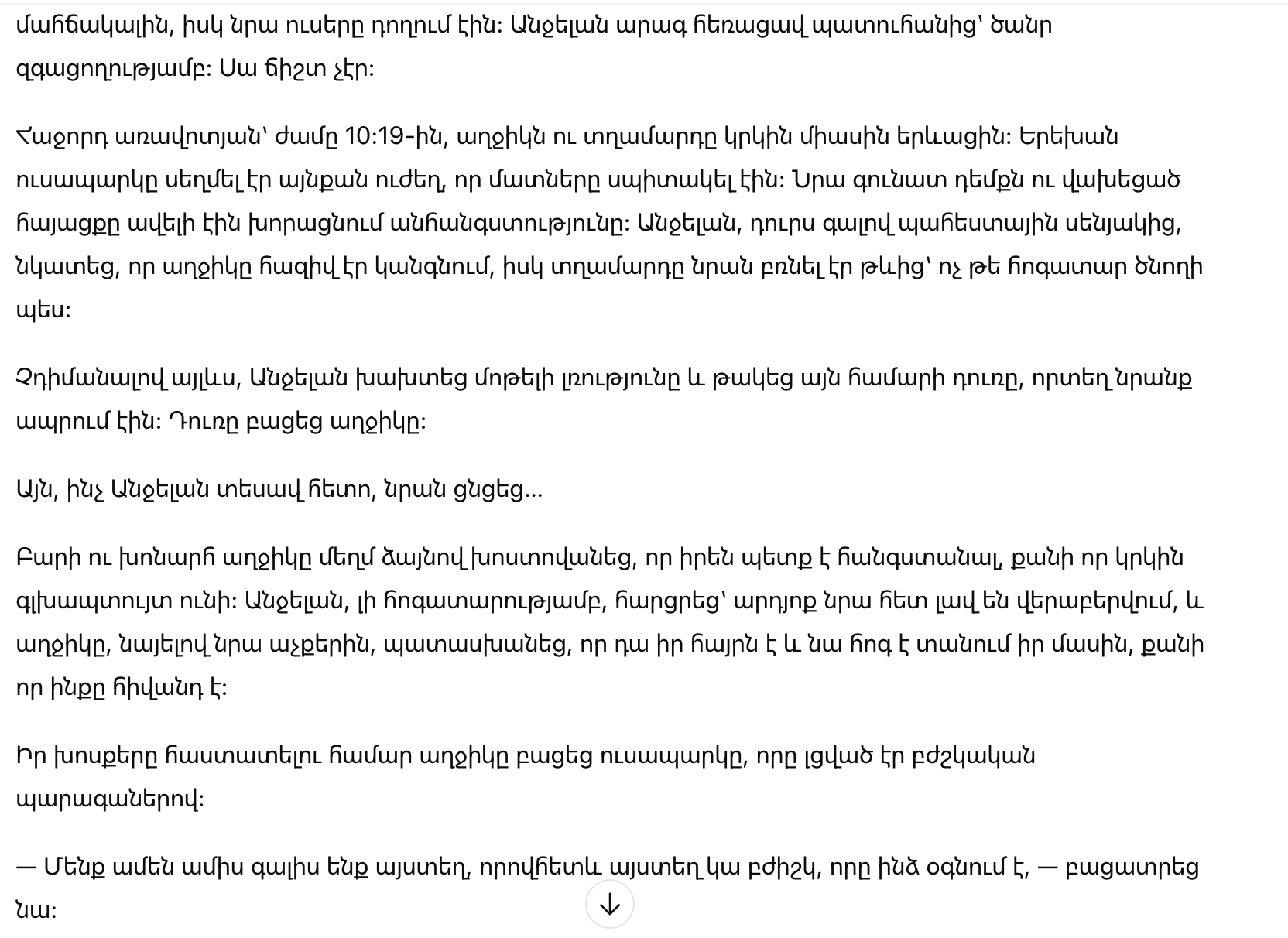 Милая девочка тихо призналась, что ей нужно отдохнуть, потому что у неё снова кружится голова. Анджела, полная заботы, задала ей вопрос о том, хорошо ли с ней обращаются, и девочка, взглянув в её глаза, ответила, что это её папа, и он заботится о ней, поскольку она больна.