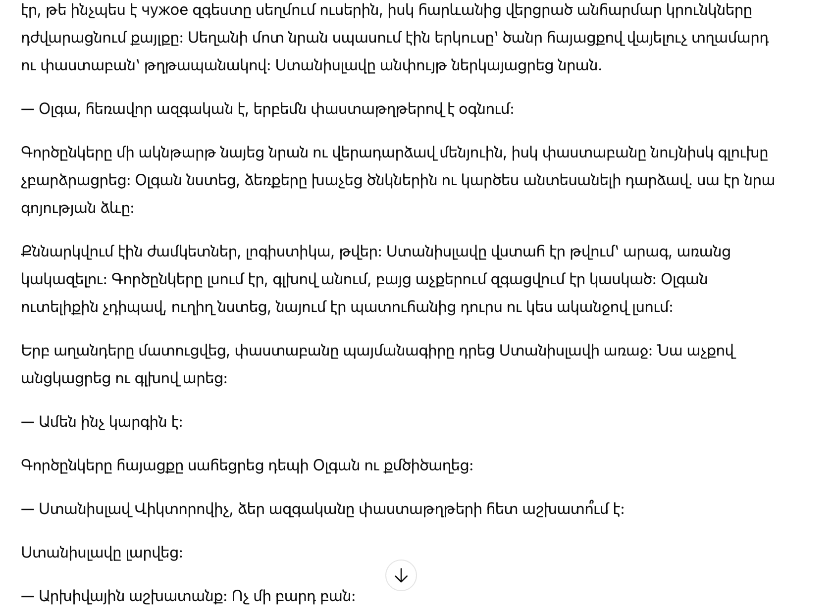 Она взяла лист и чётко, без запинок, прочитала абзац. Голос не дрожал — это было ей привычно. Затем положила документ на стол и обратилась к юристу: