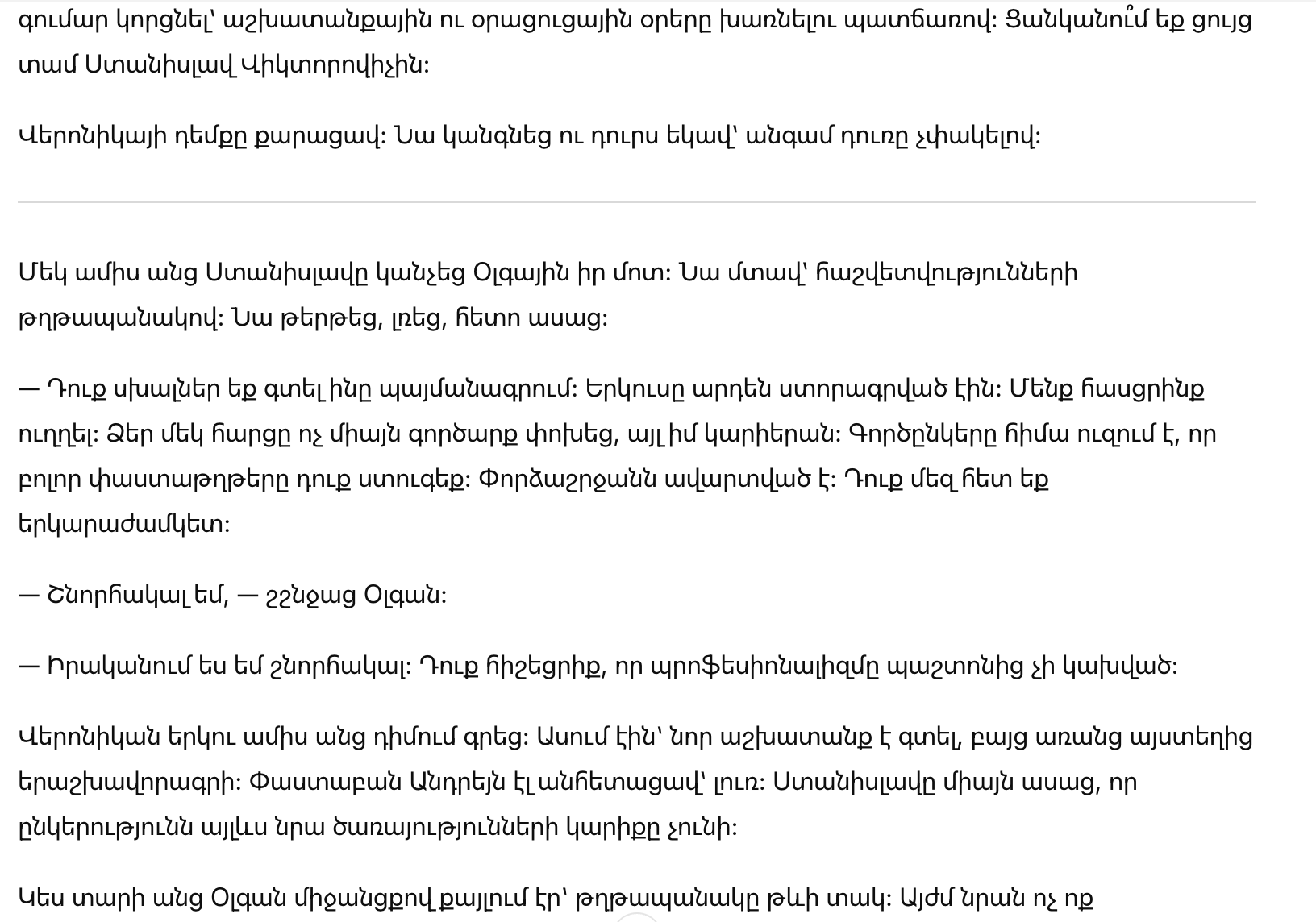 Вероника подала заявление об увольнении через два месяца после того, как Станислав на общем собеседовании публично выразил благодарность Ольге за вклад в успех компании. Говорят, что она нашла новое место, но без рекомендательного письма отсюда. Юрист Андрей тоже исчез — тихо, без лишнего шума. Станислав лишь сказал, что компания больше не нуждается в его услугах.