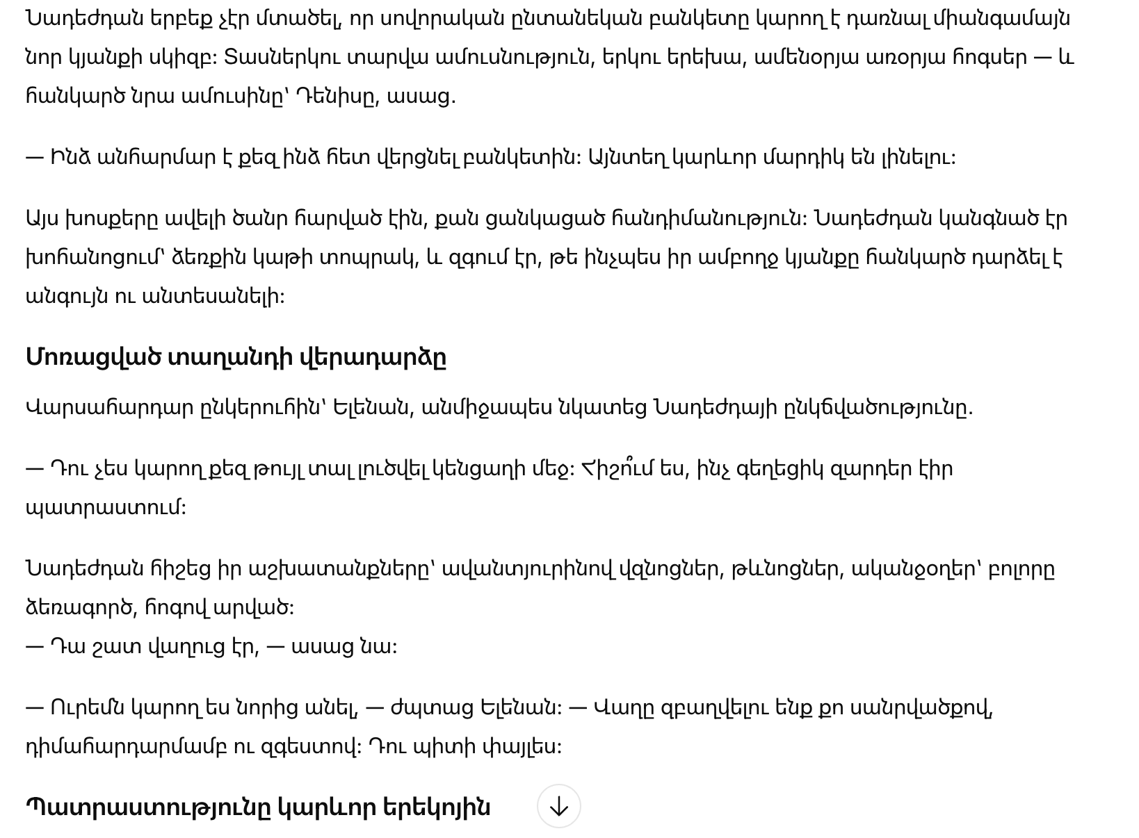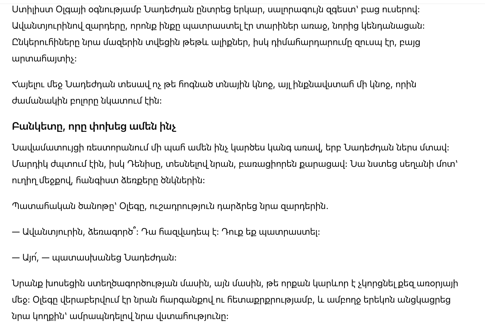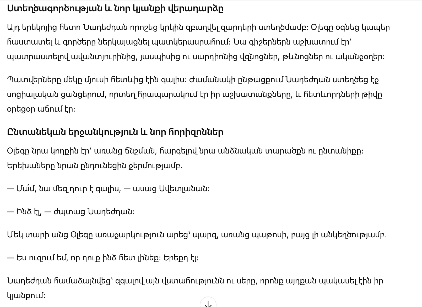 Они заговорили о творчестве, о том, как важно сохранять себя среди повседневной суеты. Олег проявлял уважение, интерес и внимание, и весь вечер провёл рядом с Надеждой, поддерживая её уверенность.