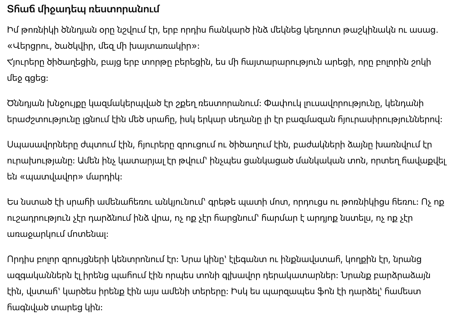 День рождения отмечали в ресторане с роскошным оформлением. Мягкий свет, живая музыка наполняли просторный зал, а длинный стол был усыпан угощениями.