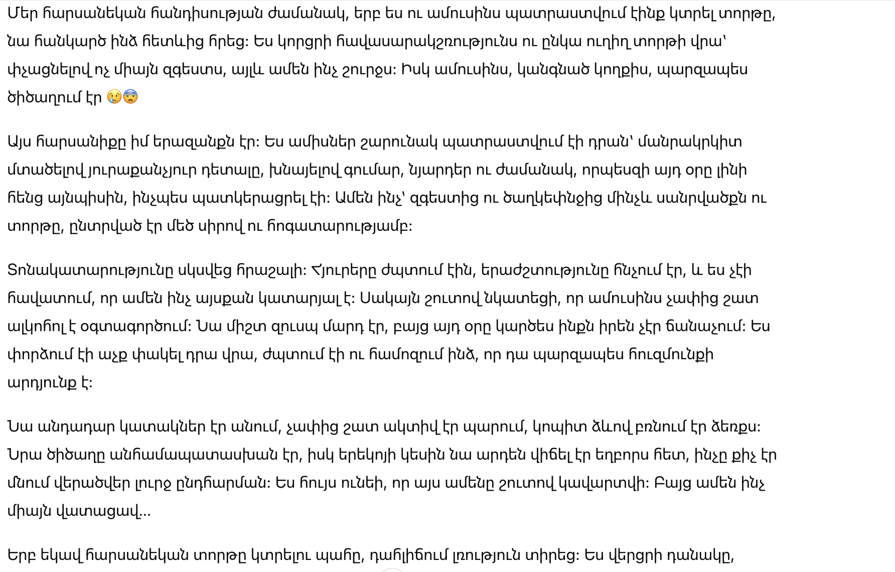 Эта свадьба была для меня мечтой, которую я готовила много месяцев. Я тщательно планировала каждую деталь, копила деньги на волнение, чтобы этот уникальный день стал именно таким, каким его представляла. Все — от платья и букета до причёски и торта — было обдумано заранее с большой любовью.