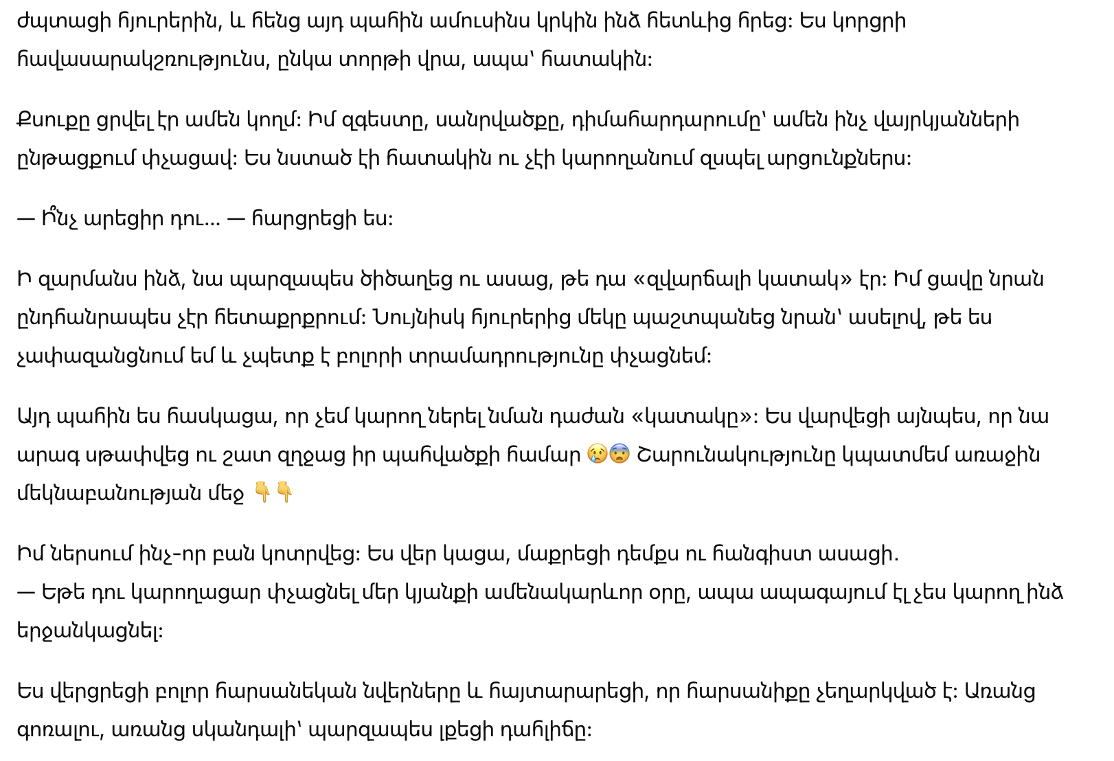 На моё удивление, муж только засмеялся и прокомментировал, что это его «смешная шутка». Ему было безразлично моё горе. Один из гостей даже поддержал его, сказав, что я преувеличиваю и не стоит из-за этого портить всем настроение.