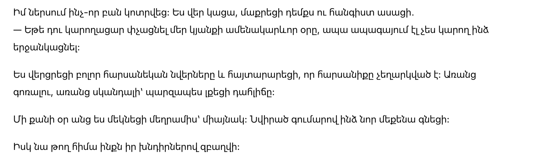 Во мне что-то сломалось. Я поднялась, вытерла лицо и спокойно произнесла: — Если ты испортил самый важный день в нашей жизни, значит, ты не сможешь сделать счастливыми и меня впоследствии.