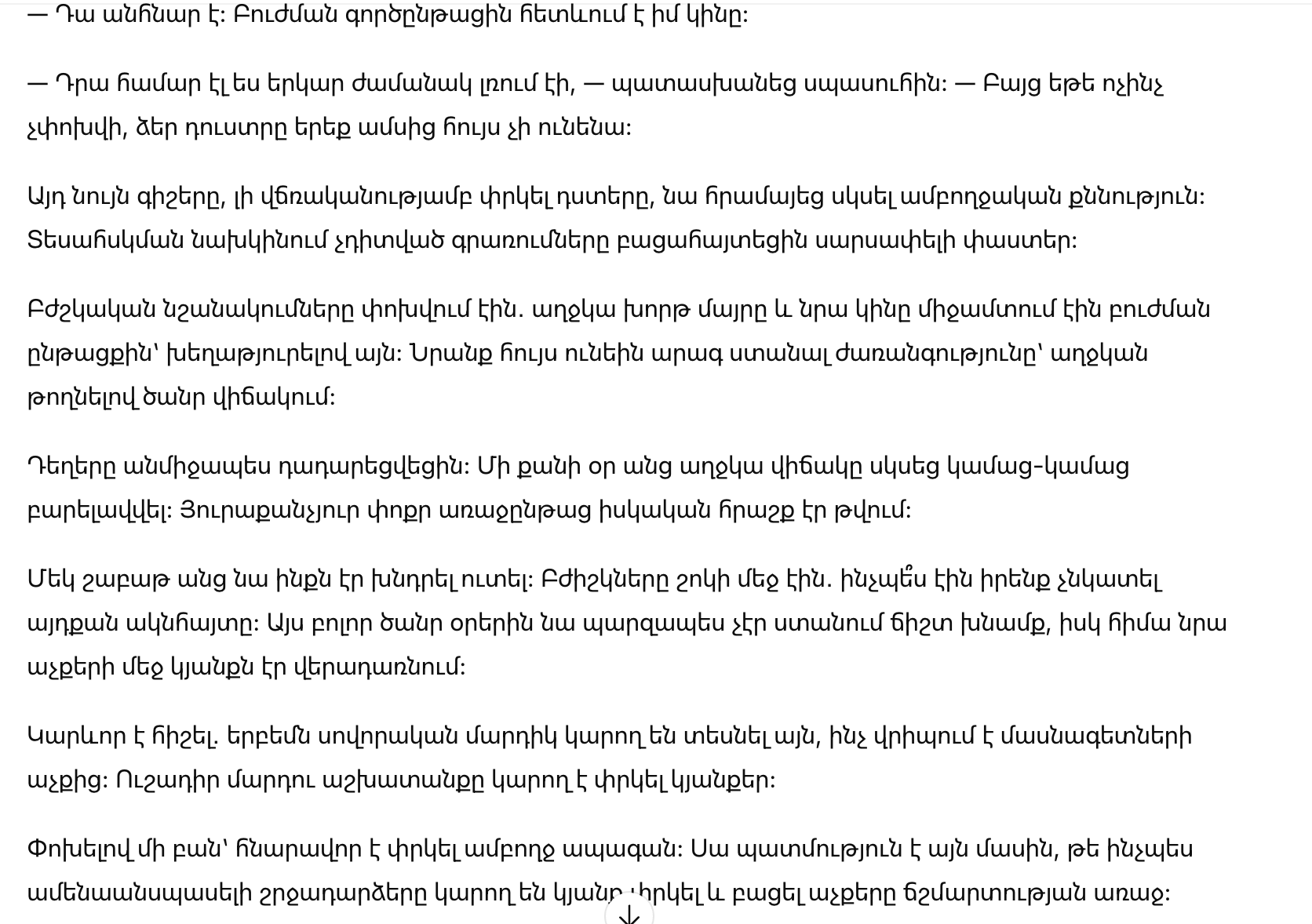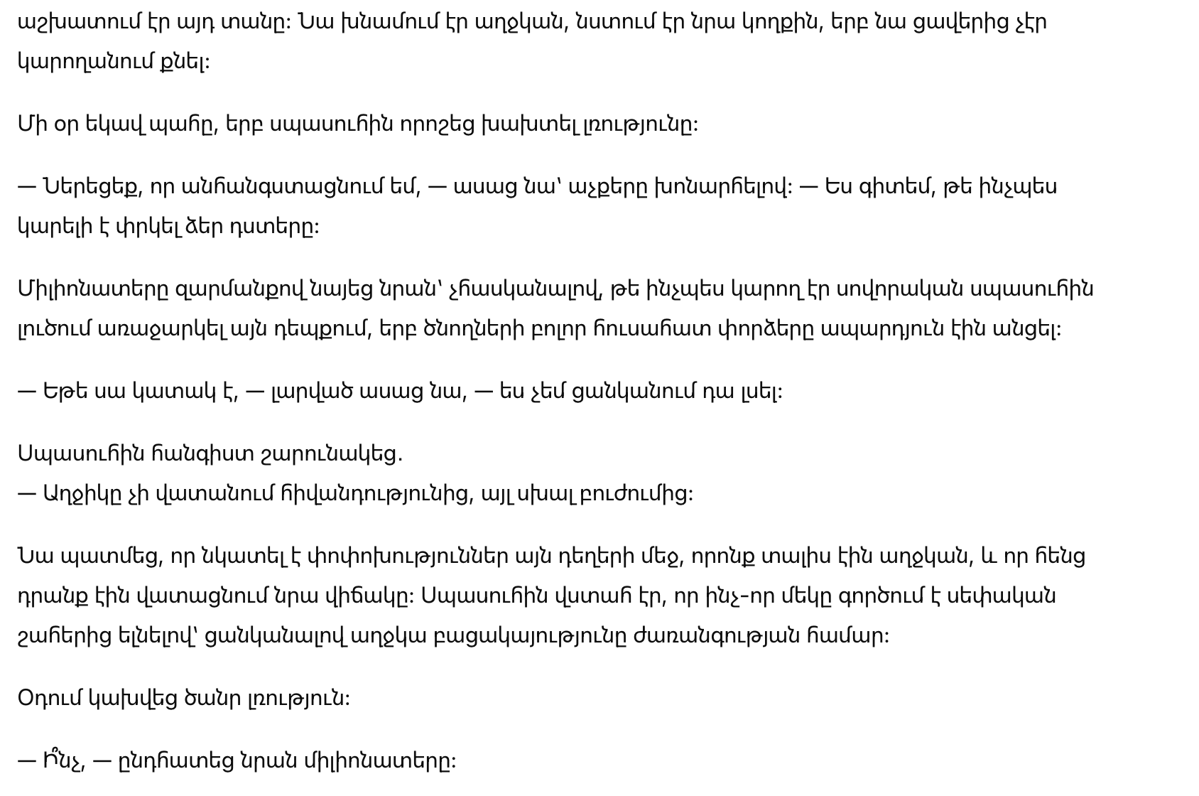 — Именно поэтому я долго молчала, — ответила горничная. — Но если ничего не изменить, ваша дочь останется без надежды через три месяца.