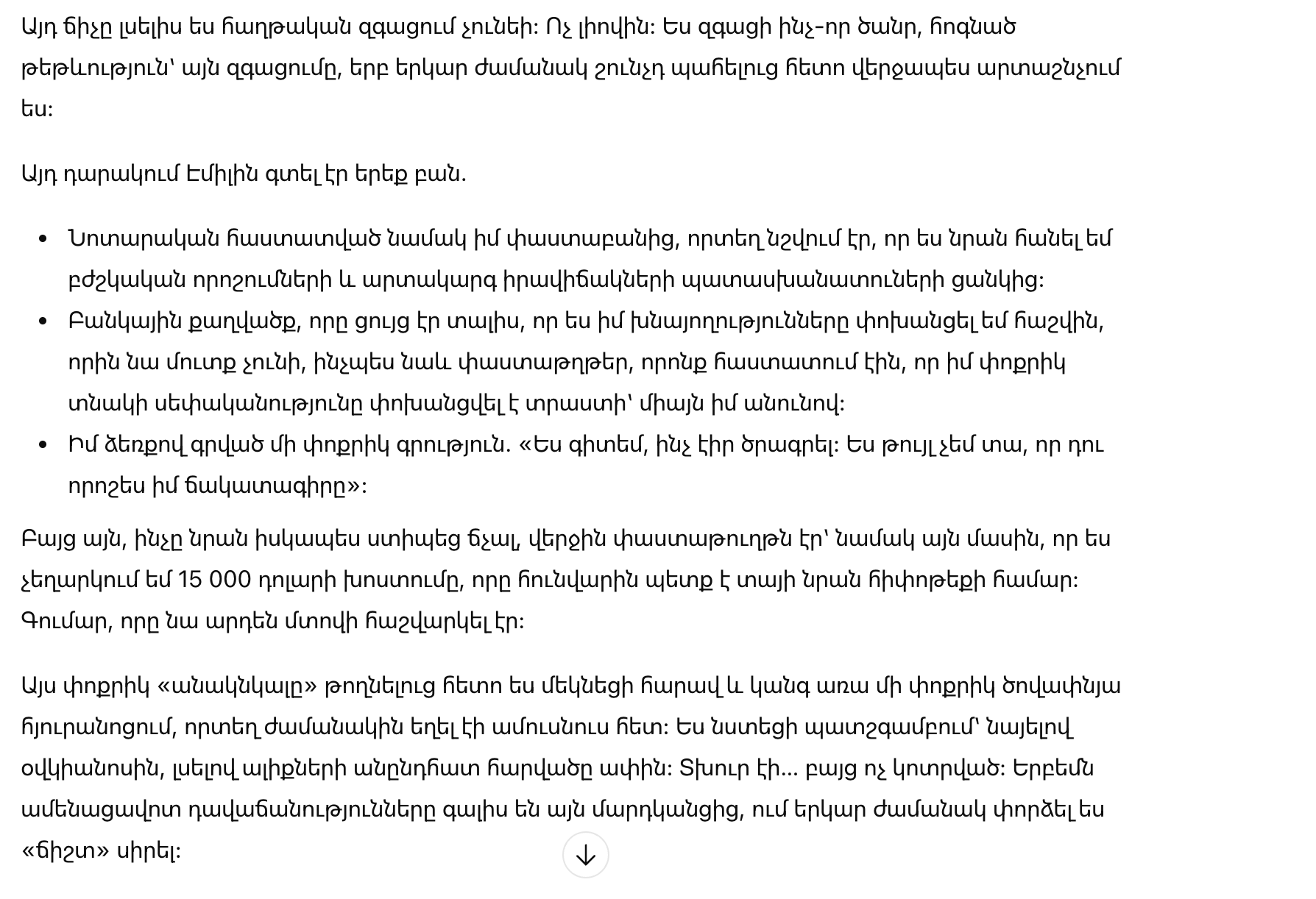 Но то, что действительно заставило её закричать — это последний документ: письмо о том, что я отменяю 15 000 долларов, которые обещала ей в январе для помощи с ипотекой — сумму, которую она уже включила в свои планы.