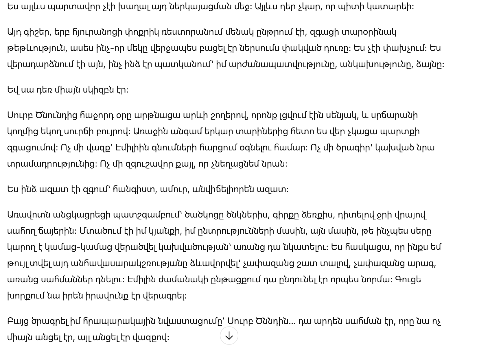 Позже той же ночью, когда я ужинала одна в маленьком ресторане гостиницы, я ощутила странную легкость, словно кто-то наконец-то открыл запертую дверь внутри меня. Я не убегала. Я возвращала то, что мне принадлежит: моё достоинство, мою независимость, мой голос.
