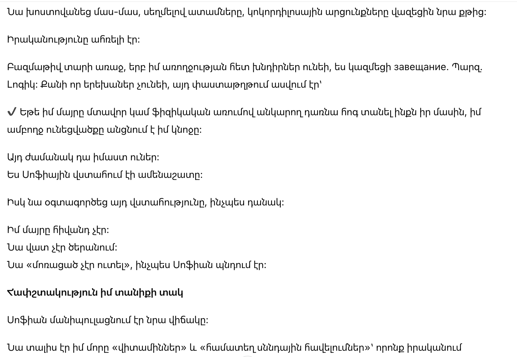 ✔ Если моя мать станет умственно или физически неспособной заботиться о себе, всё моё состояние перейдёт моей жене.
