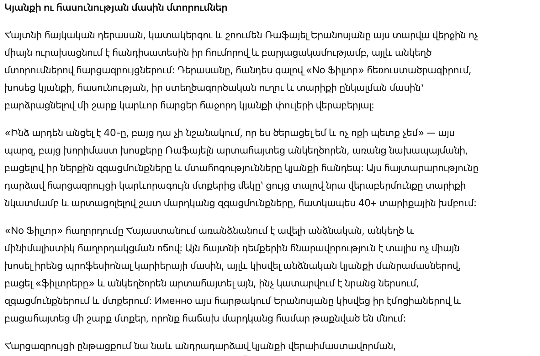 Передача «No Филтр» в Армении характеризуется более личным, откровенным и минималистичным стилем общения. Она предлагает знаменитостям обсудить не только свою профессиональную карьеру, но и делиться личной жизнью, открывая «фильтры» и давая возможность честно говорить о том, что происходит внутри, в их чувствах и мыслях. Именно на этой платформе Ераноссян поделился своими эмоциями и раскрытым рядом мыслей, которые зачастую остаются скрытыми для многих.