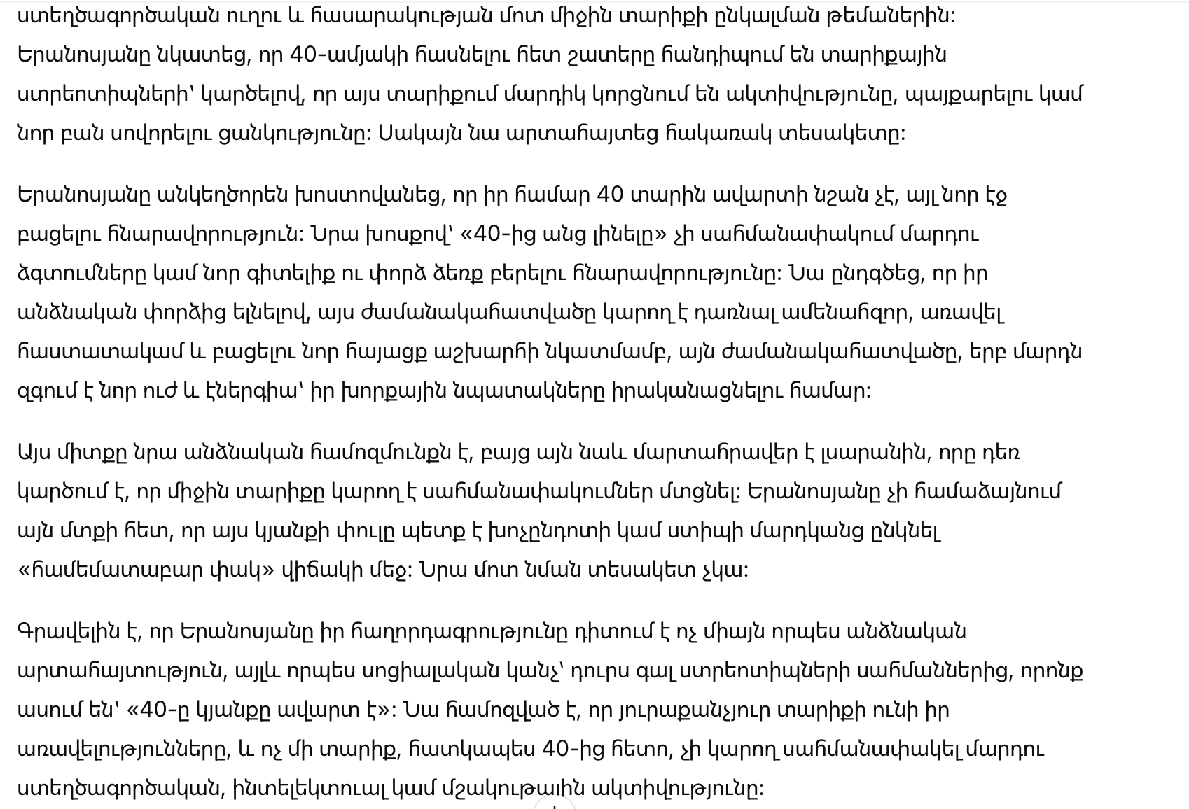 Важно отметить, что Ераноссян рассматривает свое сообщение не только как личное выражение, но и как социальный призыв выйти за рамки стереотипов о «40 — это конец жизни». Он считает, что каждый возраст несет свои преимущества, и ни один возраст, особенно после 40, не может ограничить творческую, интеллектуальную или культурную активность человека.