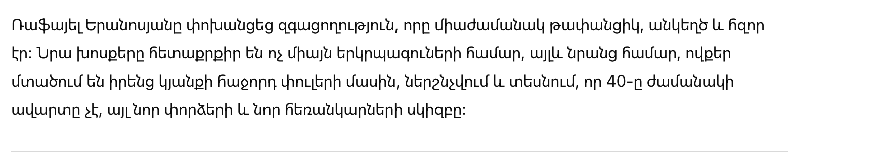 Рафэль Ераноссян передал чувство, которое одновременно было прозрачным, искренним и мощным. Его слова интересуют не только поклонников, но и тех, кто размышляет о следующем этапе жизни, черпая вдохновение и видя, что 40 — это не конец времен, а начало нового, полного опыта и новых перспектив.