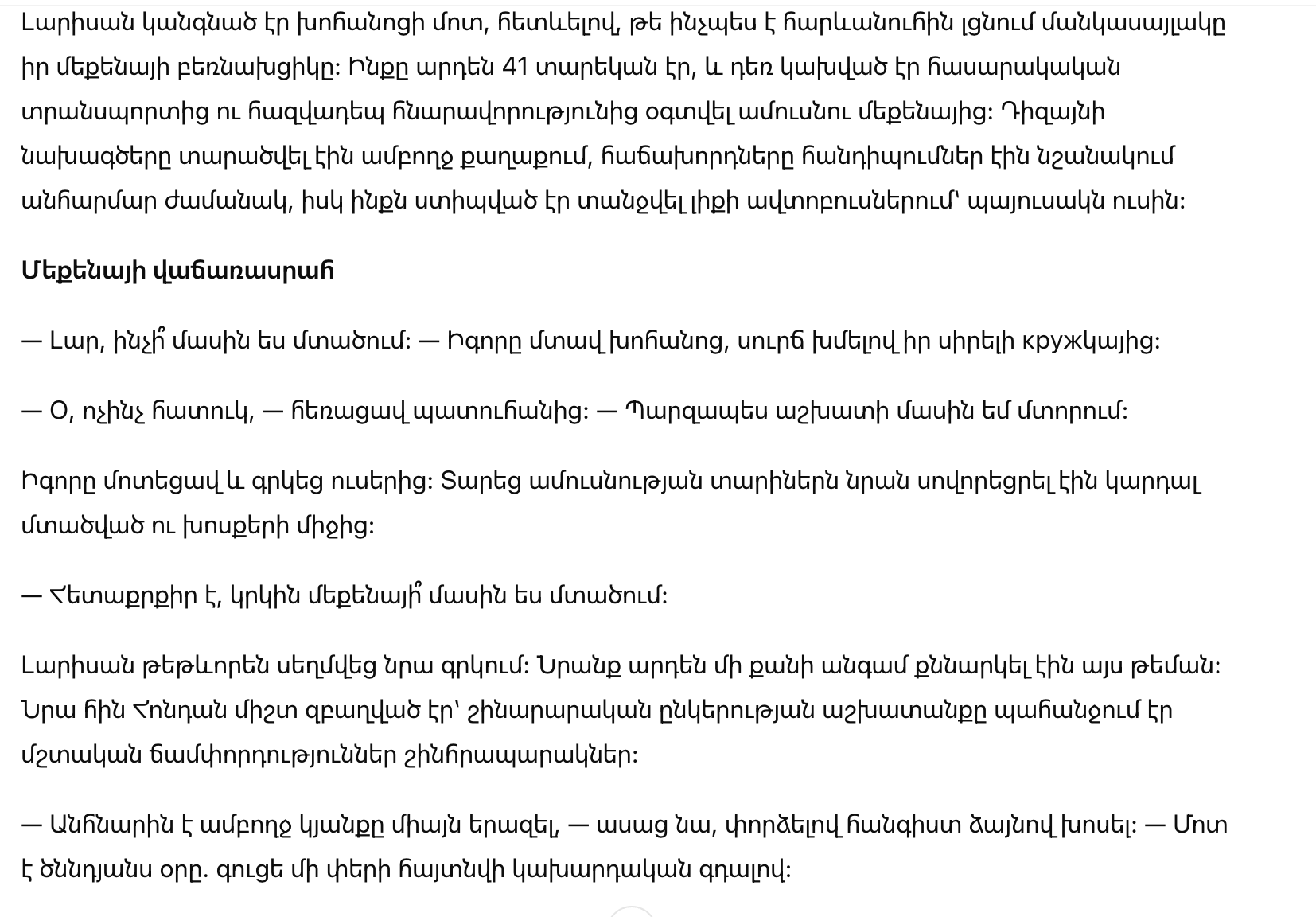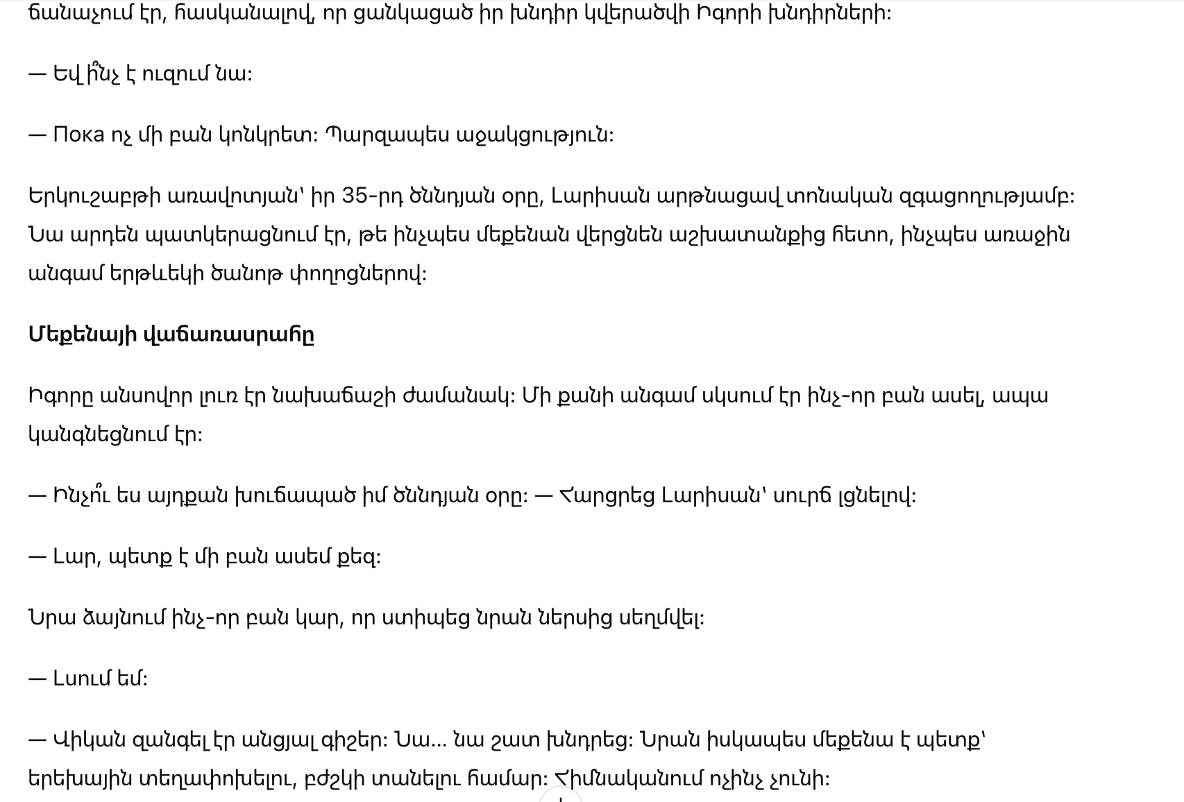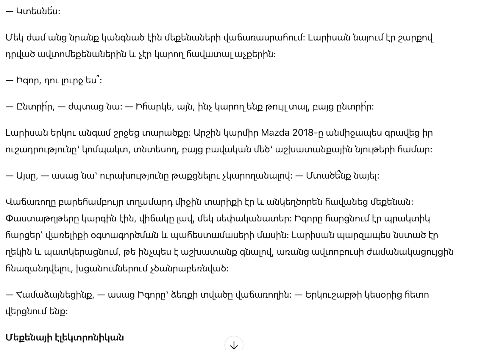 — Игорь, мне тридцать пять. Я мечтала о машине всю свою взрослую жизнь. Ты обещал мне одну; я верила тебе и была в восторге. А затем ты решил, что твоя сестра важнее, чем твоя жена. У меня есть право?
