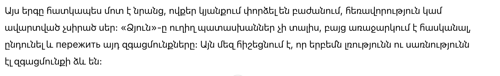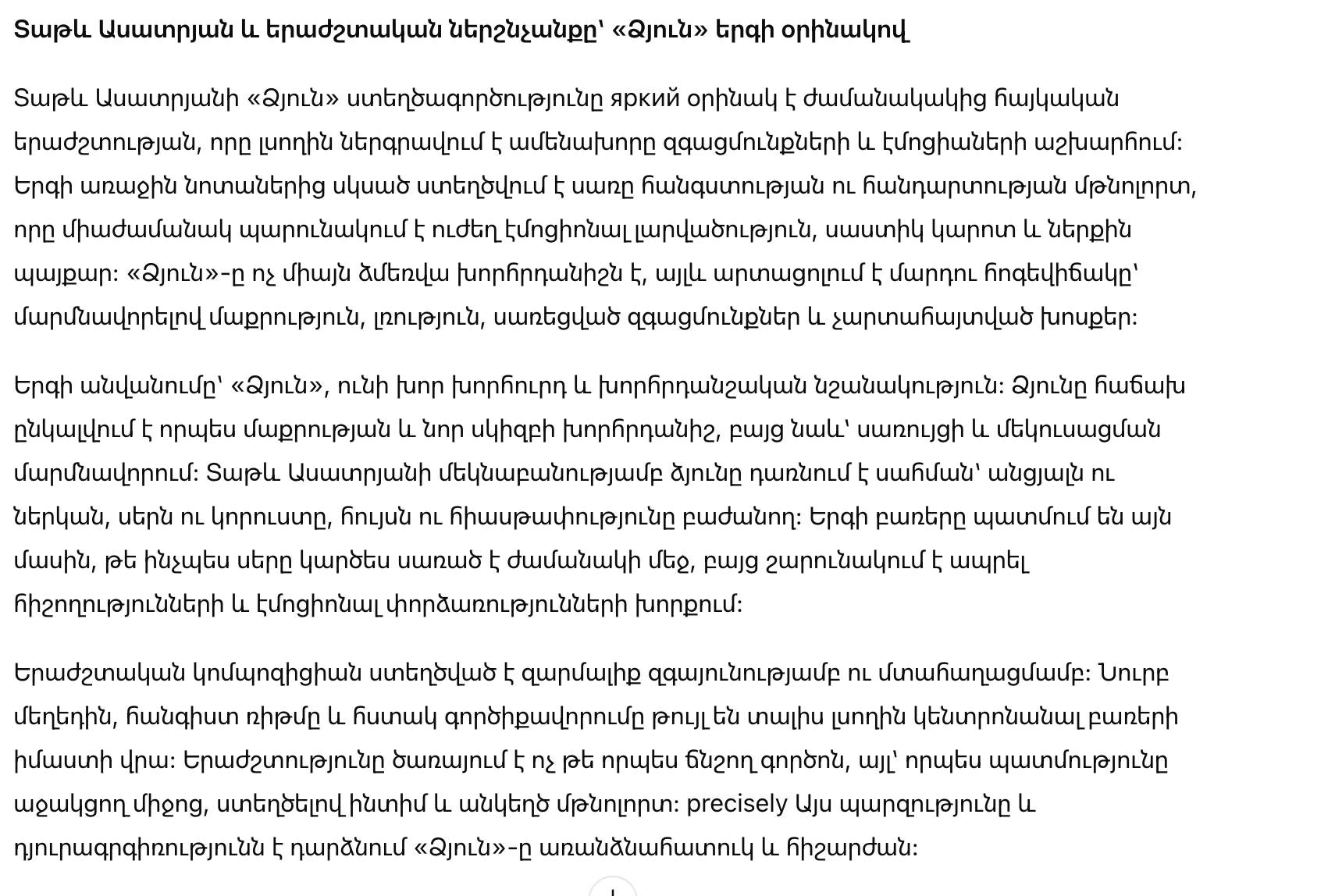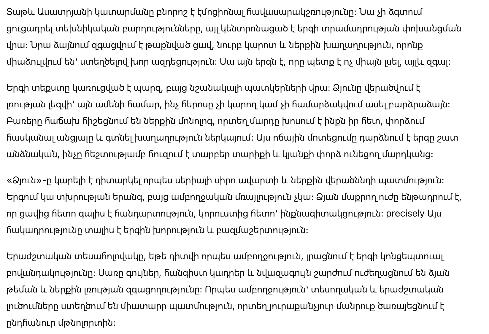 Исполнение Татев Асатрян характеризуется эмоциональным балансом. Она не стремится демонстрировать технические сложности, а сосредотачивается на передаче настроения песни. В её голосе ощущается скрытая боль, нежная тоска и внутренняя успокоенность, которые переплетаются, создавая глубокое воздействие. Это та песня, которую следует не просто слушать, а прочувствовать.