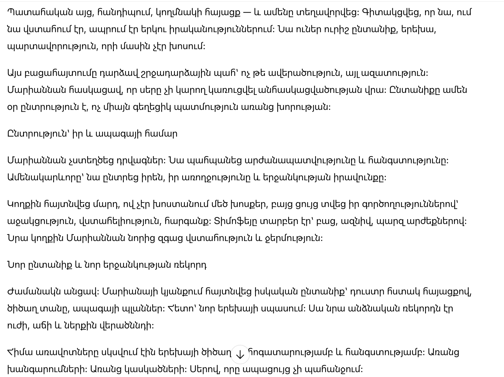 Это открытие стало поворотной точкой. Не разрушением, а освобождением. Марьяна поняла: любовь не может строиться на недоговорённостях. Семья — это выбор каждый день, а не красивая история без глубины.