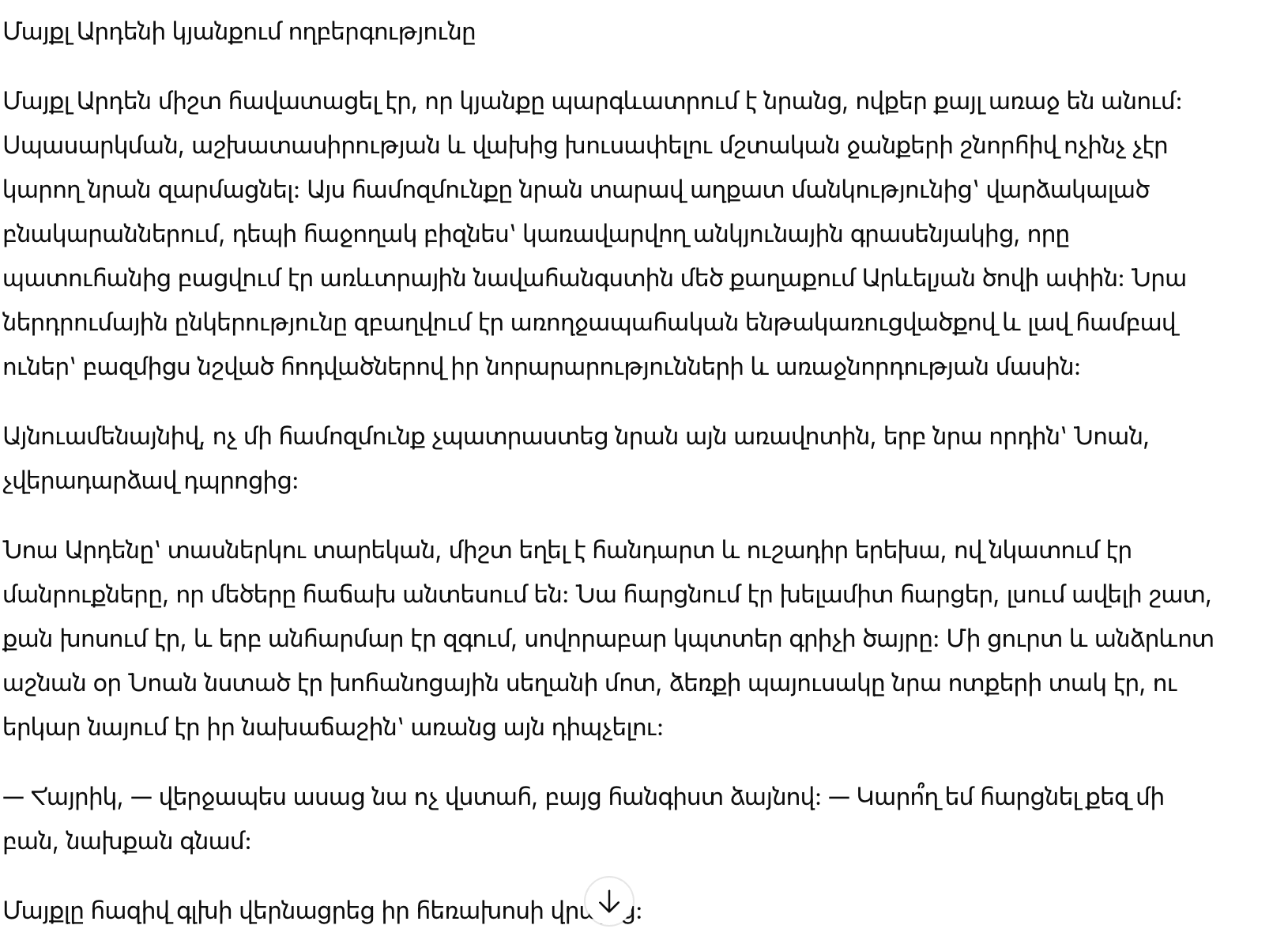 Ноа Арден, двенадцатилетний мальчик, всегда был спокойным и внимательным ребёнком, способным замечать детали, которые взрослые часто игнорируют. Он задавал умные вопросы и слушал больше, чем говорил, а когда ему становилось неуютно, обычно теребил кончик ручки. В один холодный и дождливый осенний день Ноа сидел на кухонном столе, его рюкзак был у его ног, и он долго смотрел на свой завтрак, так и не тронув его.