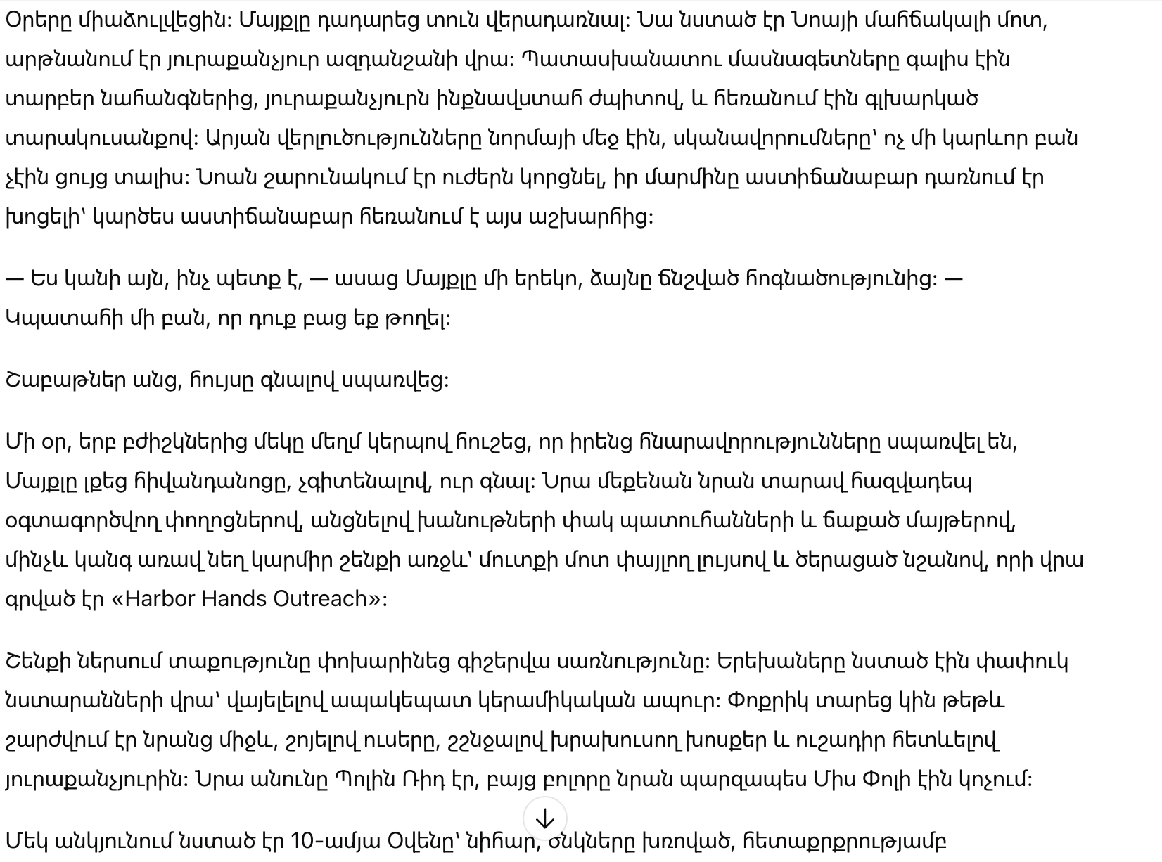 Однажды, после того как один из врачей мягко намекнул, что они исчерпали свои возможности, Майкл покинул больницу, не зная, куда идти. Его машина привела его по улицам, которыми он редко пользовался, мимо запечатанных витрин и треснувших тротуаров, пока он не остановился перед узким кирпичным зданием, осенённым мерцающим светом у входа и с выцветшей вывеской, на которой читалось «Harbor Hands Outreach».