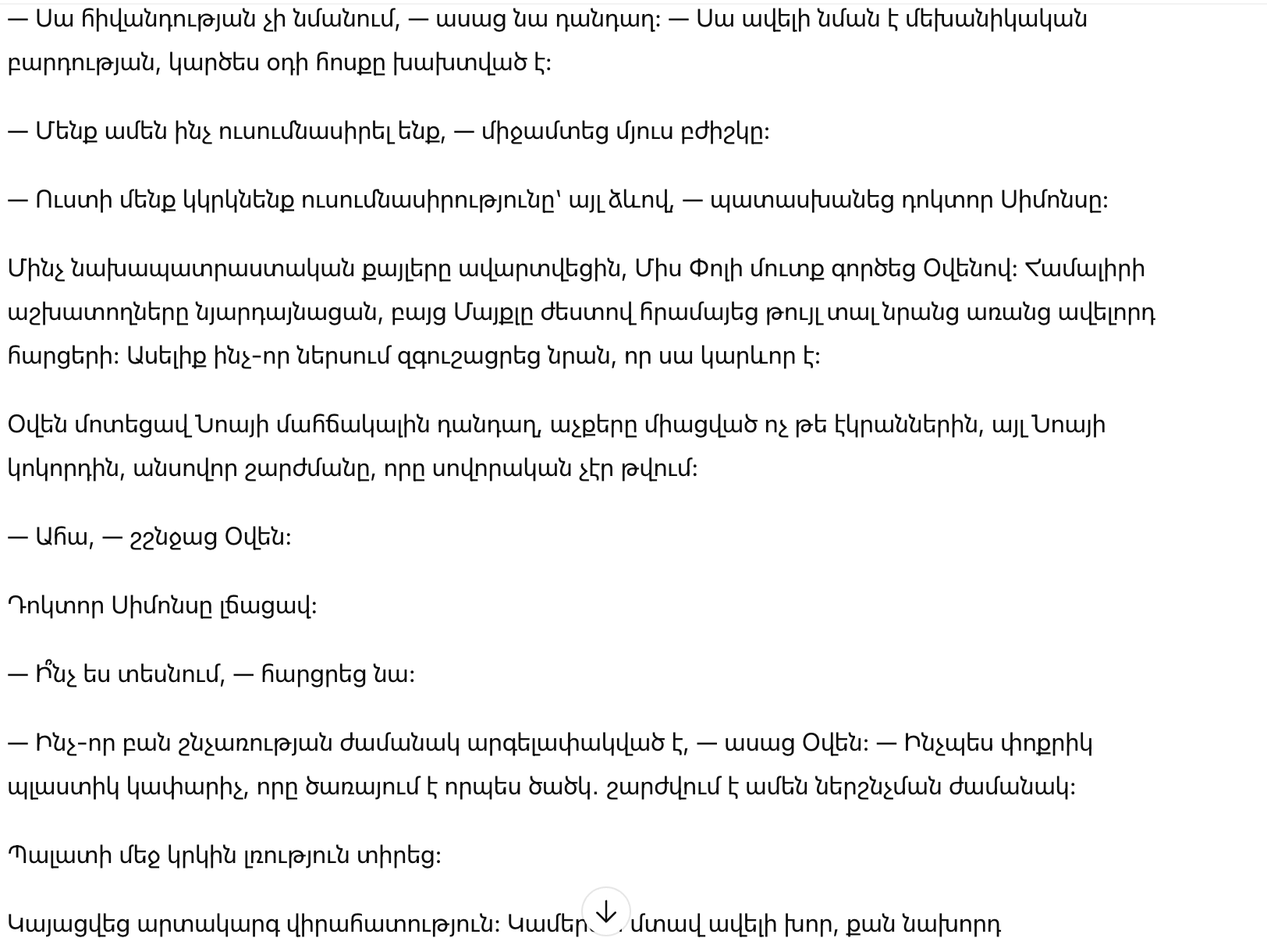 «Эта ситуация не напоминает болезнь», сказала она медленно. «Это больше похоже на что-то механическое, как будто поток воздуха нарушен».