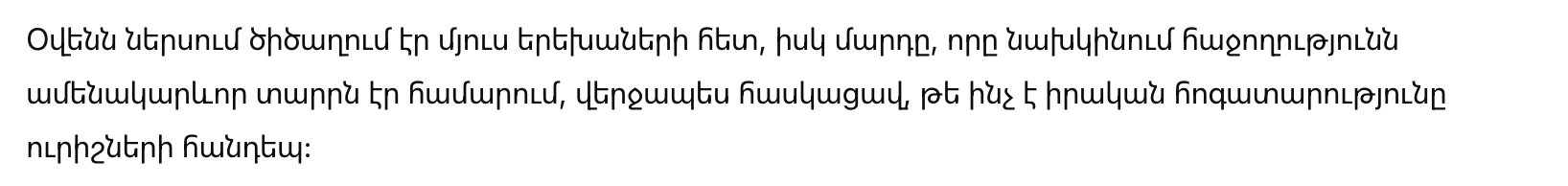Внутри Оуэн смеялся с другими детьми, и человек, который когда-то считал успех единственным важным элементом, наконец осознал, что значит по-настоящему заботиться о других.