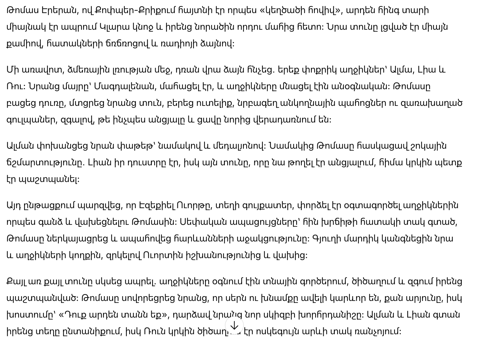 В следующие дни дом изменился в ритме. Три пары маленьких рук научились собирать яйца, кормить кур, подогревать воду. Ру смеялась, гоняясь за упрямым петухом. Альма старалась сохранять достоинство той, кто играет в мать в четырнадцать. Лия следила за каждым движением Томаса, будто хотела понять его.