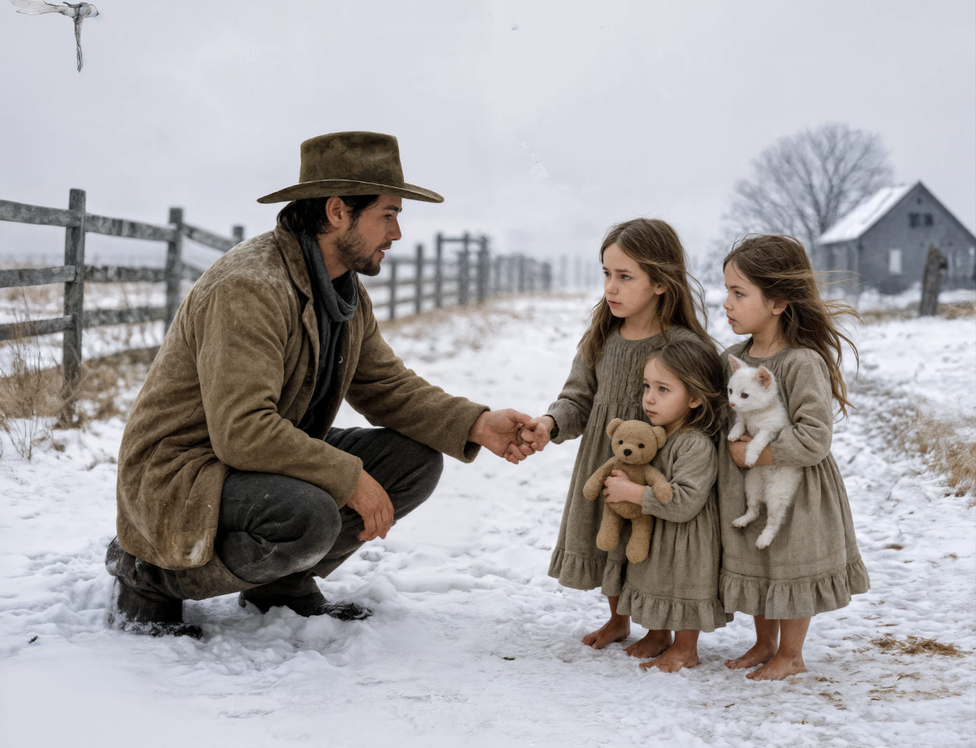 В то утро, когда все было укрыто белым, тишина была нарушена робким стуком в дверь. Томас наливал кофе, когда услышал второй, более слабый стук, словно гость боялся, что открытие двери станет ошибкой. Когда он открыл, холодный воздух ударил ему в лицо, и крыльцо показалось немым куском застывшего мира. На снегу дрожали три маленькие девочки.
