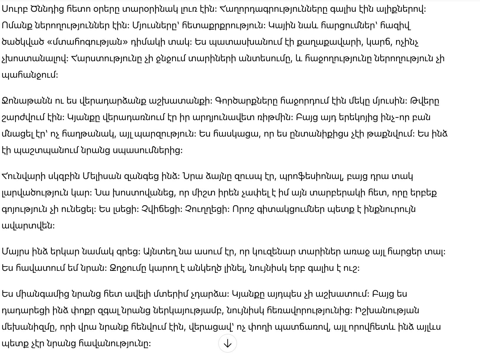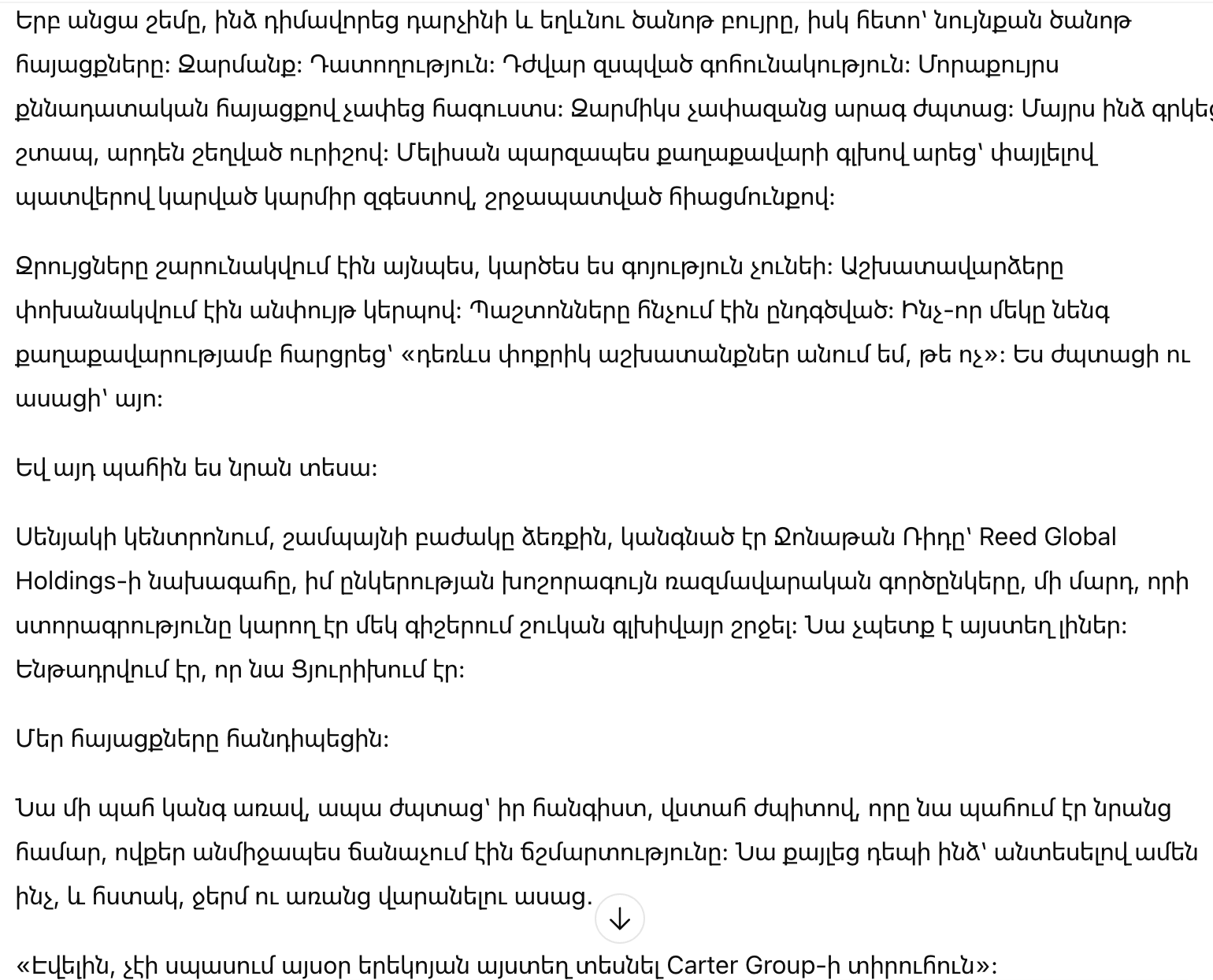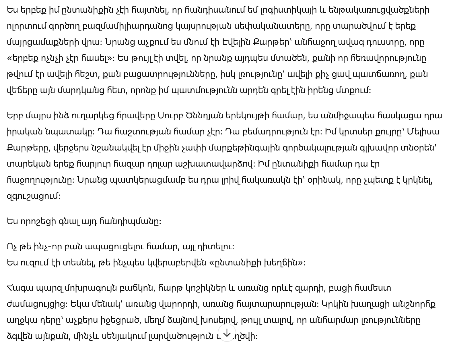 Надела простой серый пиджак, плоские туфли и никаких украшений, кроме скромных часов. Я пришла одна, без водителя, без объявления. Я снова сыграла роль неуклюжей девушки: опустив глаза, тихим голосом, позволяя неловким паузам затягиваться до того момента, чтобы создать дискомфорт.