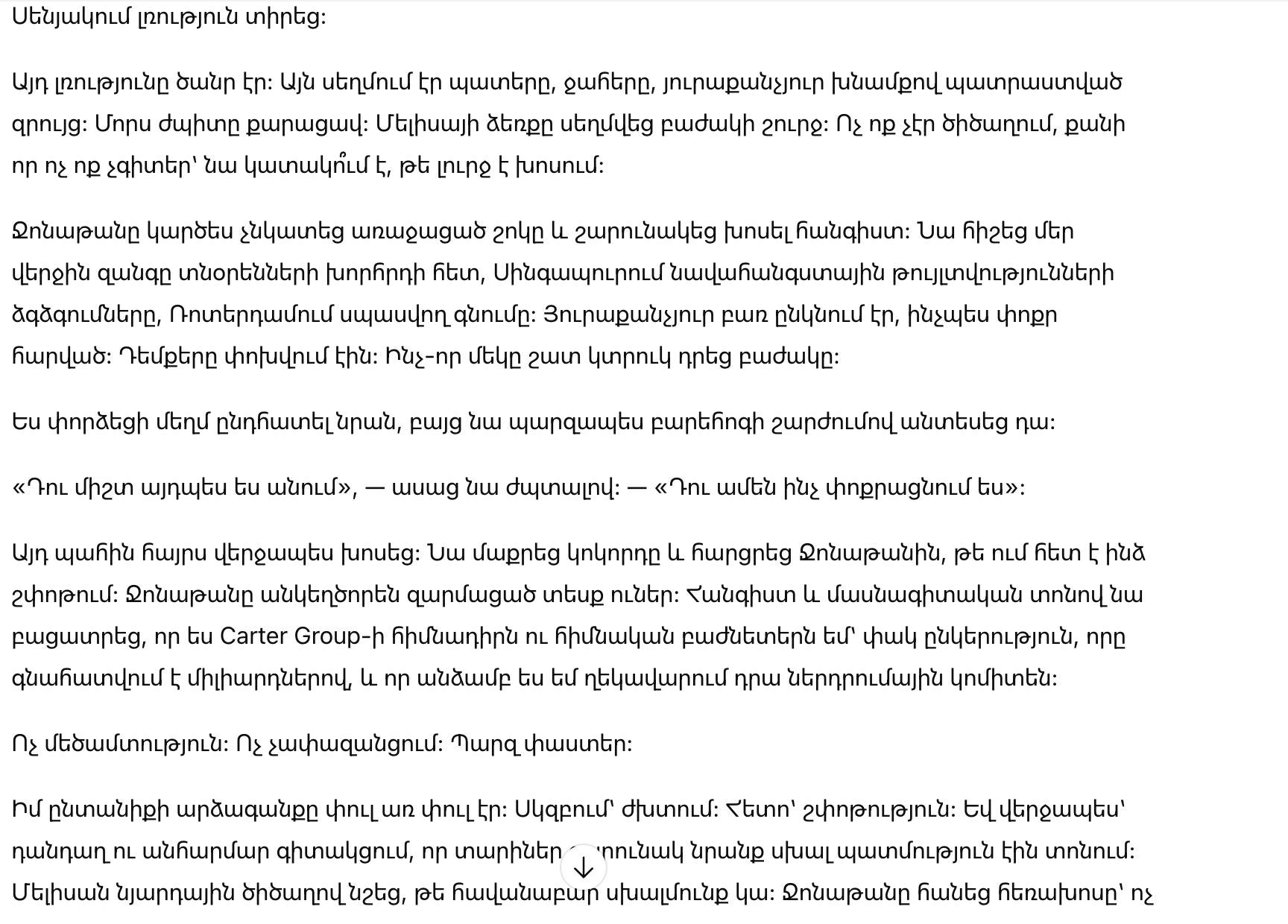 Тогда мой отец наконец решился заговорить. Он очистил горло и спросил у Джонатана, за кого он меня принимает. Джонатан выглядел искренне озадаченным. Спокойно и с профессионализмом он объяснил, что я являюсь основателем и мажоритарным акционером Carter Group, закрытой компании, оцененной в миллиарды, и что я лично возглавляю ее инвестиционный комитет.