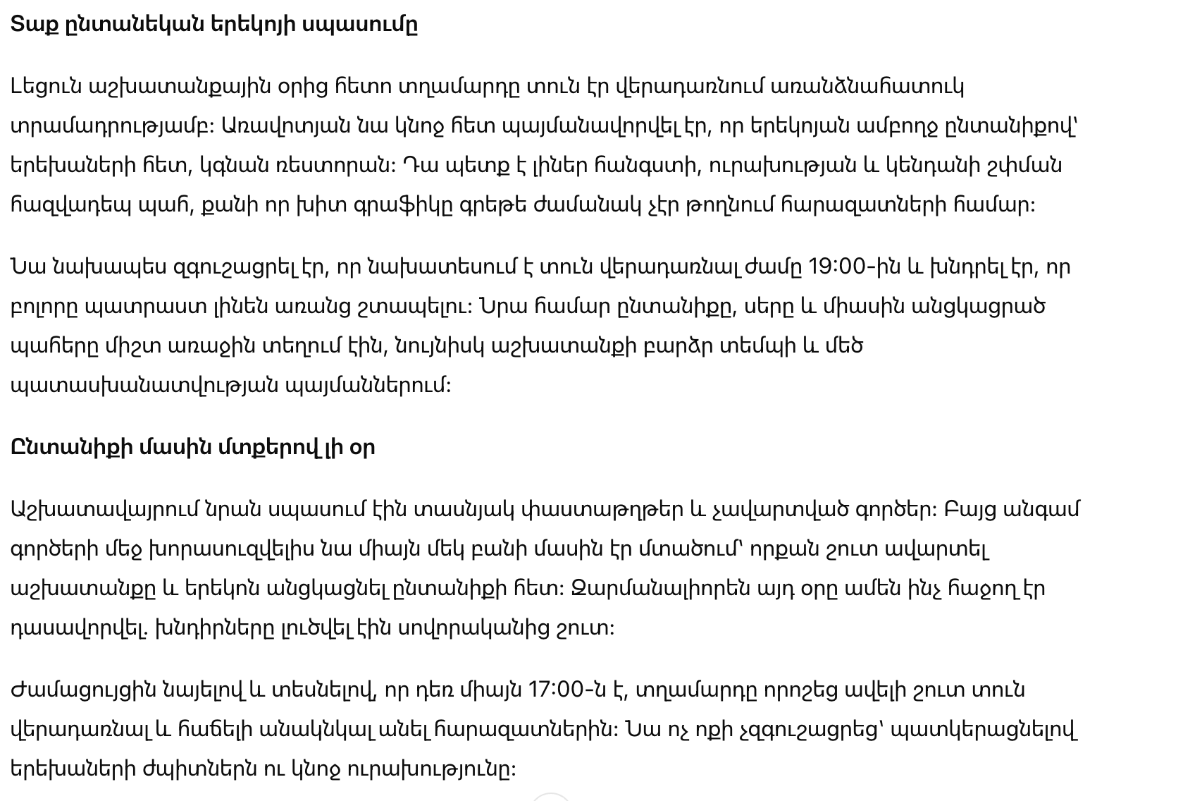 На работе его ждали десятки документов и незавершенных задач. Но даже погружаясь в дела, он думал лишь об одном — как быстрее закончить и провести вечер с семьей. Удивительно, но в этот день все сложилось удачно: задачи были решены раньше обычного.