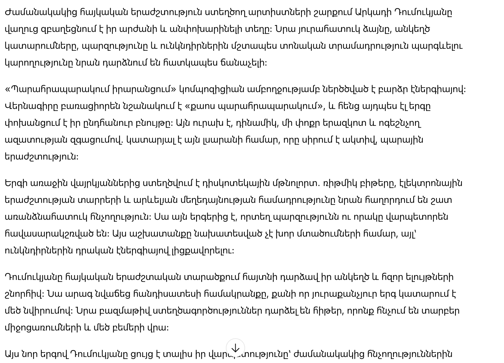 Среди современных армянских артистов, создающих музыку, Аркадий Думукян давно занимает свое достойное и незаменимое место. Его уникальный голос, искренние исполнения, простота и способность всегда дарить слушателям праздничное настроение делают его особенно узнаваемым.