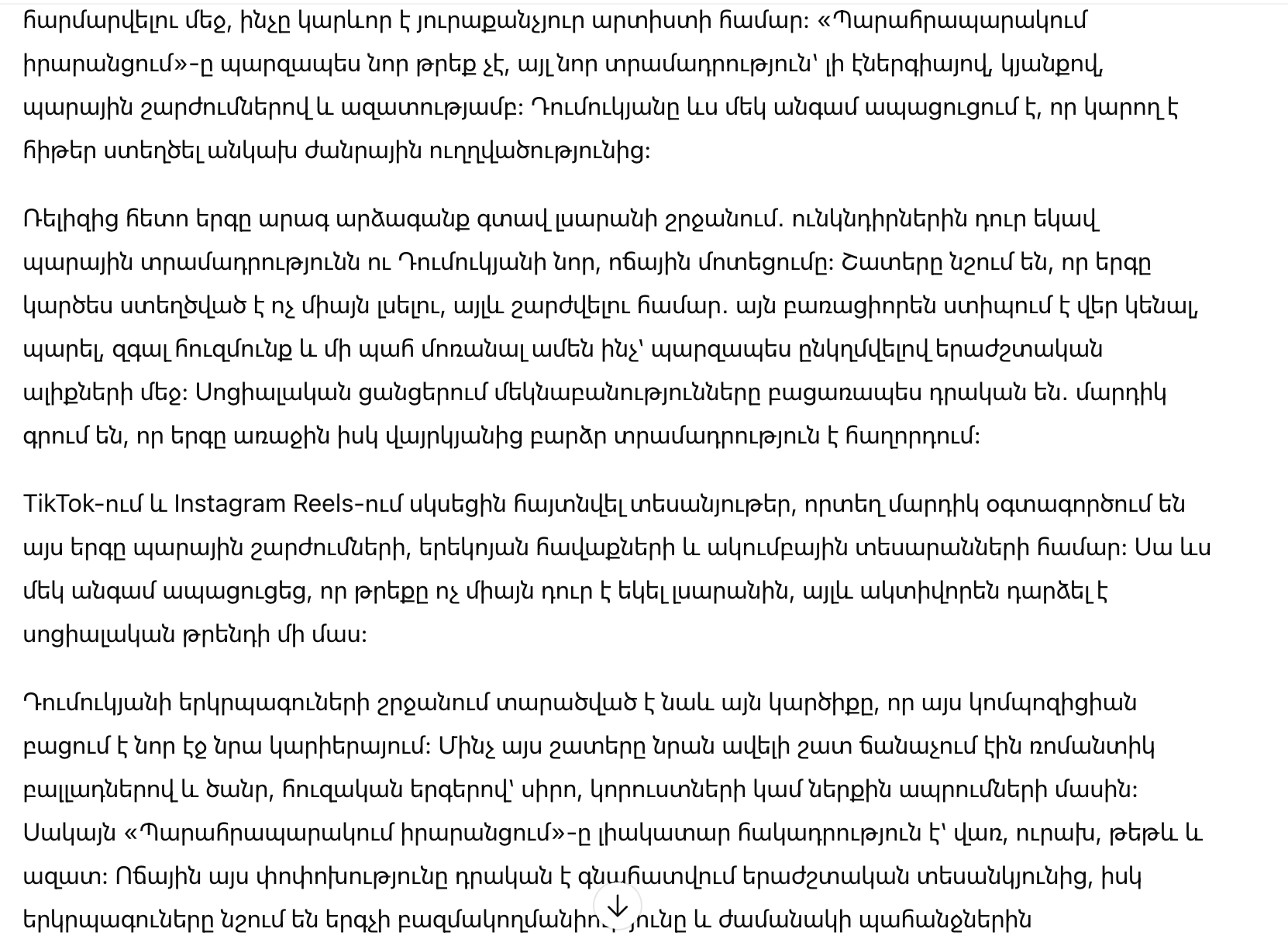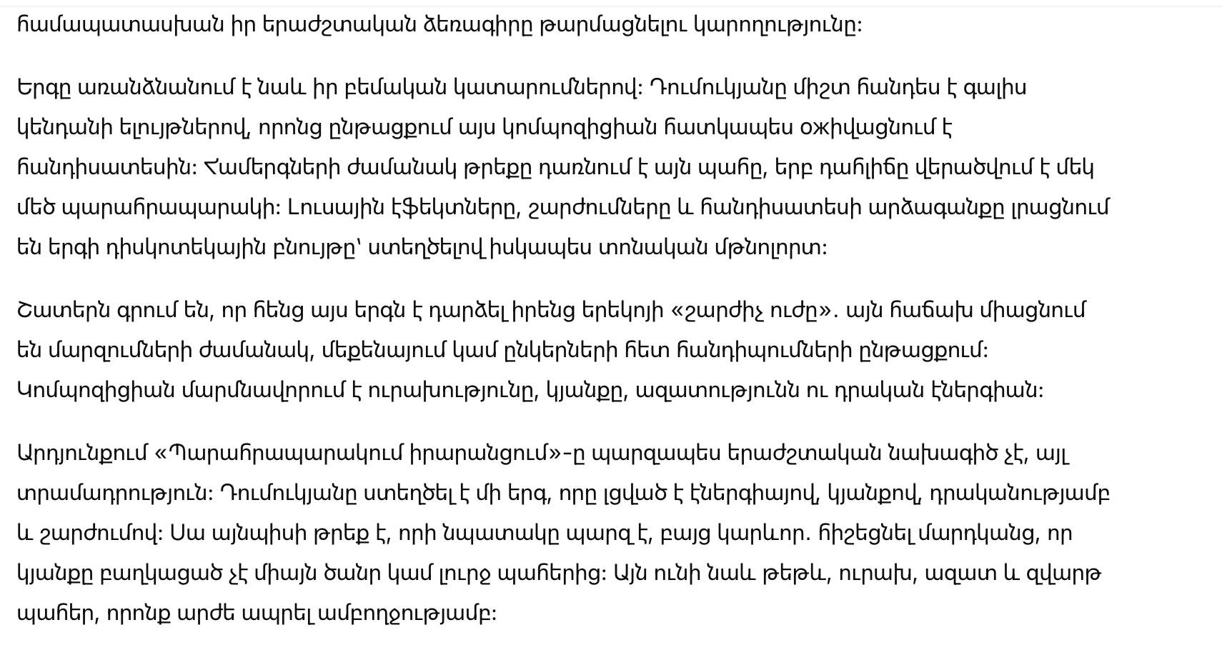С помощью этой новой песни Думукян демонстрирует свое мастерство в адаптации к современным звукам. Это имеет важное значение для каждого артиста. «На танцполе суета» — это не просто новый трек, а новый настрой, полный энергии, жизни, танцевальных движений и свободы. Думукян снова подтверждает, что способен создавать хиты независимо от жанровой направленности.