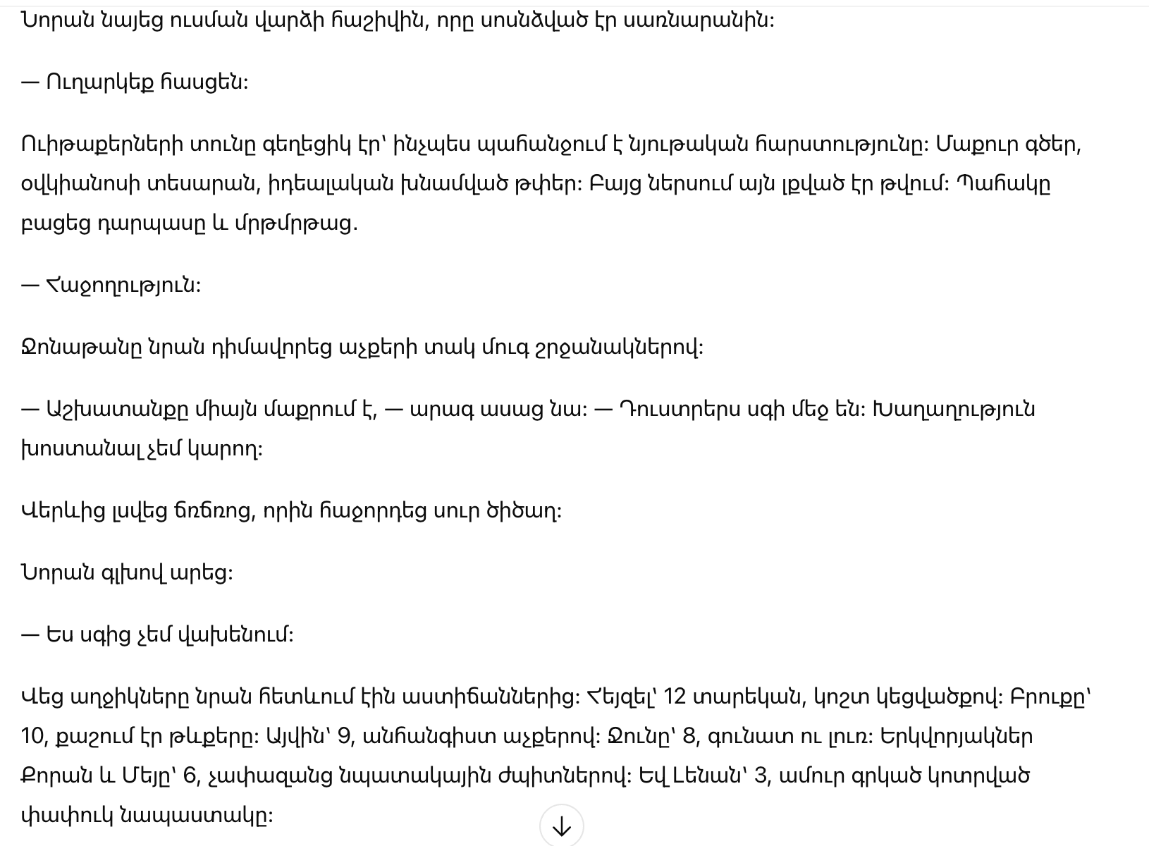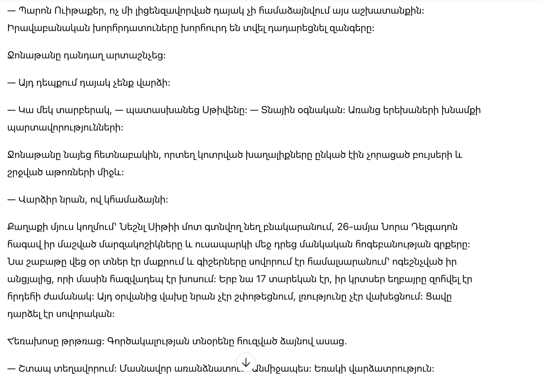 — Впечатляющая деталь, — сказала она, возвращая его. — Но страх требует контекста. Вам придется постараться больше.