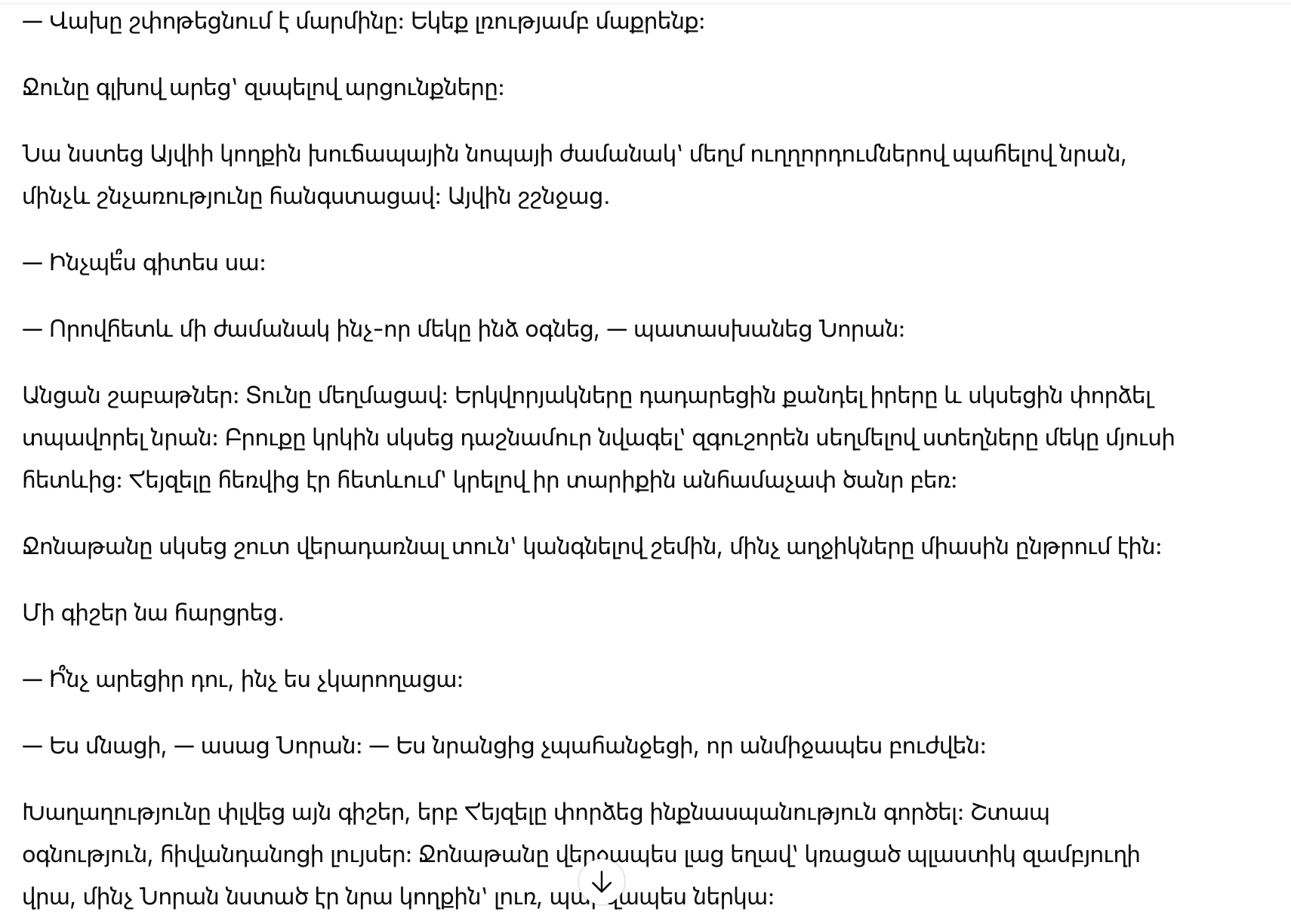 Иллюзия разрушилась в ту ночь, когда Хейзел попыталась совершить самоубийство. Скорая помощь, свет в больнице. Джонатан наконец заплакал, склонившись в пластиковой корзине, в то время как Нора сидела рядом, молча и присутствуя.