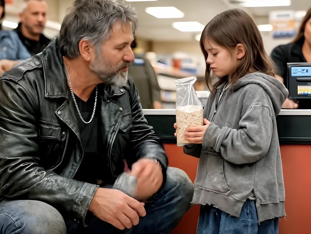 Супермаркет вдруг стал странно тихим, когда к ним подошел мужчина в черной кожаной куртке. Он был высоким, широкоплечим, его куртка выглядела изношенной, словно она прошла тысячи километров. Серебряная цепочка свисала у него на шее. Его борода была с проседью, а его ботинки мягко звучали на плитке, когда он приближался.